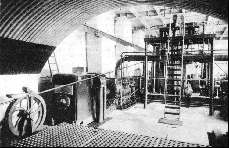 For the duplication of the entire line, which was begun in 1895, a new route was chosen. This fact must be borne in mind when comparing the heights and other data of the new with the old. The journey from Santos to Piassaguera takes only about 20 minutes. The average weight of train which can be hauled on the inclines is 120 tons, comprising six loaded wagons, weighing eighty-nine tons, and the locomotive brake which weighs thirty-one tons forty-six tons of this is paying load. The time necessary to run a trip is nine minutes for each of the five stages; of this, seven and a half minutes is running time and the other minute and a half is for the change over of ropes on each bankhead. The vertical rise from bankhead to bankhead is 525 ft. About 5,000 tons of merchandise are hauled up every day; on the average. The five inclines, each with its separate hauling plant, work simultaneously, so that when the inclines are working there are always five trains ascending and five descending, the vehicles on one side of a rope being balanced by those on the other. The goods or passengers may or may not be equal in weight in both trains, but statistics show that the average unbalanced load is insignificant and on the down side. The power house contains four boilers to supply steam to the hauling engines. Two or three of the boilers are in steam according to the demands of the traffic. They are of the Lancashire type. 7 ft. 6 in. in diameter and 27 ft. long, and are fitted with a patent mechanical stoker for supplying the furnaces with coal, and also with a patent economiser for heating the feed water before it is fed into the boilers. Steam at 100 lb. pressure is supplied to the hauling engines through a ten-inch diameter steel pipe which passes from the boilers to the engine houses. The hauling engines, each of approximately 1,000 horse-power, are of the two-cylinder condensing type; the cylinders, having a diameter of 32 in. and a stroke of 5 ft., are fitted with valves operated by link motion and a special trip gear. There are two motion shafts on which are mounted the rope drums for driving the wire rope, and also the large flywheels, 25 ft. in diameter. These serve to connect the two shafts by means of sixteen cotton ropes, so that the second motion shaft shall be driven by the engine equally with the crankshaft.