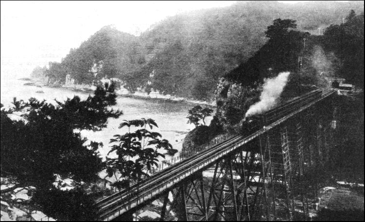 From the outset the British engineers sent out to supervise the work found themselves faced with almost insuperable difficulties. They soon discovered that Japan was not suited to railway construction—the country was mountainous, while earthquakes and landslides were common. A heavy rain, for instance, would change streams—mere beds of sand for the greater part of the year—into wild, surging rivers that would suddenly rush down and sweep away bridges and embankments. As a result of the preliminary survey, the original plan to link the northern and southern capitals had to undergo drastic revision. For military reasons, the Japanese were anxious for the line to take a middle course—following the Nakasendo, or backbone of the country—but, as the difficulties proved to be insuperable, the idea could not be carried out. The only alternative was to follow the Tokaido, the great highway of Eastern Japan, which skirts the coast along the narrow strip of flat country intervening between the foot of the hills and the Pacific Ocean. This route was open to the possibility of an attack from the sea side in time of war, but the less mountainous nature of the country to be traversed forced the Japanese to agree to its adoption, despite its strategic shortcomings. The Shimbashi-Yokohama section and the Kobe-Osaka section were both begun in 1870. Trouble caused by the capricious nature of Japanese rivers was encountered at its worst between Kobe and Osaka. Owing to the masses of sand and pebbles continually carried down by their rapid currents, the rivers in this neighbourhood tend to raise their beds to a height well above the level of the surrounding fields. The river-bed thus stands athwart a flat strip of country, as a sort of wall or dyke, and the only thing the English engineers could do was to take the line underneath it by a tunnel, when the wall was of sufficient height to give headway for the train. This method of tackling the trouble, although a good one and still adopted in present-day railway construction in Japan, did not entirely dispose of the problem, of crossing a troublesome river. But when bridges are relied on, it is a common occurrence for the river bank to burst, causing the whole countryside to be flooded, and putting the railway department to heavy expense. Apart from disasters of this kind, the recurrence of torrential rains, typhoons, and earthquakes causes havoc which almost every year throws the system into temporary disorder. The gauge adopted for these sections was one of 3 ft. 6 in., which has since become the standard gauge of the Japanese railways. When completed, these sections formed practically the nucleus of what now constitutes the Tokaido line, one of the main arteries of railway traffic in Japan. In 1880 the Kyoto-Otsu section was completed, and in 1884 a further extension, with a length of 65 miles between Tsuruga and Nagahama, a town by Lake Biwa, was completed and opened to traffic in pursuance of the idea of linking the Pacific and the Japan Sea by railway. Meanwhile, a survey was made in the large northern island of Hokkaido, on the Otaru-Horonai section, which was urgently required for colonization. This section was opened in 1882.