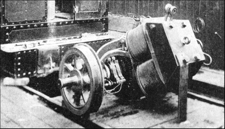 The City and South London Railway was operated by electric locomotives— quite small machines which, however, continued in service for over thirty years. The line was reconstructed between 1922 and 1924, with standard tunnels, of 11 ft. 8-1/4 in. diameter. The cast iron tubes of the original line were of only 10 ft. 2 in. diameter. The old City and South London Railway now forms part of the great north-to-south line under London between Edgware in Middlesex, and Morden in Surrey, via the Bank. The locomotives ran on four wheels, of 2 ft. 3 in. diameter, and weighed about 12 tons. The length was 14 ft. with a width of 6 ft. 8-1/2 in. and a height of 8 ft. 6 in. The wheelbase was 6 ft. The frames and axle bearings were placed outside the wheels. Each axle was driven by an independent motor and the armatures were built directly on the axles. The field magnets surrounding the armatures were supported partly by brackets bearing on the axles and partly by links connecting the magnet yokes to a cross beam on the frame of this early engine. Each motor developed 50 h.p., giving a tractive effort of 3,000 lb. with an electric current of 226 amperes. The trains, weighing 40 tons, were hauled at an average speed of twelve miles an hour, with a maximum of twenty to twenty-five miles an hour. An interesting feature of these early locomotives was the use of the Westinghouse air brake. No motor-driven air-compressor was fitted, as on modern electric trains, for working the brakes, but a supply of compressed air was carried in two reservoirs on the engine. These reservoirs were charged with air at 80 lb. pressure at the beginning of each journey, thus making provision for some thirty stops. A powerful hand-screw brake was also fitted in the driver's cab. The permanent way comprised flat-footed rails, weighing 60 lb. per yard, spiked to sleepers, the ends of which rested on the cast iron lining of the tunnel. The electrical conductor consisted of a light steel rail supported on glass insulators fixed to alternate sleepers. This conductor rail was set one inch below the level of the running rails, and wooden ramps were provided at points and crossings to carry the collectors over the rails, thus avoiding a short-circuit. The engine was provided with two sliding collectors, one at either end, so that the supply of current was continuous, despite the lifting of one collector by a crossing ramp. The collectors were connected, through a safety fuse and main switch, to a rheostat switch for use on starting. Current at full pressure cannot be led direct to the motors ; it must be applied gradually through a rheostat or resistance. The current, after flowing through the motors, passes through the locomotive axle-boxes and wheels to the rails, and so returns to the generating station.