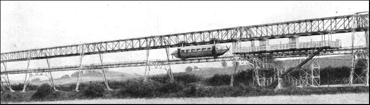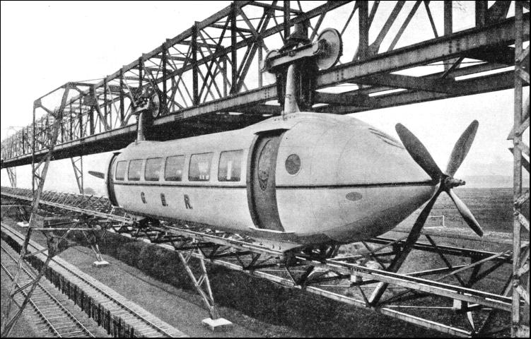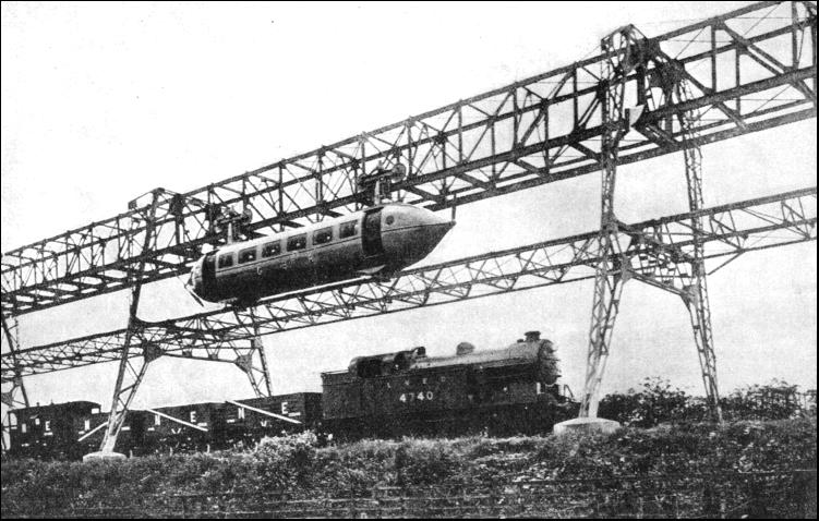 Inventors have turned their attention to new systems of railway transport giving high speeds to compete with motor-car and air transport and to retain the safety of railway travel. On ordinary railways it is not the building of steam, electric, or Diesel locomotives to travel at high speeds which presents the chief difficulty, but the problem of keeping them stable on the tracks on which they run. In 1930 a German, Herr Paul Kruckenburg, fitted an air screw propeller to a passenger coach weighing twenty-eight tons. The air screw was driven by a 600 h.p. oil engine and hauled the coach along a specially prepared length of track in German at a speed at over 140 miles an hour. Herr Kruckenburg did not take chances; his trial track had all movable points removed and there were no curves. His line was dead straight; had he run on to a curve at that speed his coach would have been flung off the rails like a stone from a string. The results of Herr Kruckenburg's experiments have given encouragement to inventors who are studying this problem of high speed, and they have also demonstrated that the limit of speed on railway tracks is confined to the tracks and not to the locomotives. Realisation of these limitations has led inventors to develop their ideas of high-speed railways on lines different from those of conventional railways. One of the most interesting of these inventions is the railplane system of transport. This is a monorail system, the cars being hung from an overhead rail. When this system was introduced the idea seemed to be somewhat bizarre but there were those who saw possibilities in the system, and the railplane has been developed. It is claimed to be one of the fastest, safest and cheapest means of land transport. A length of track has been erected over a section of the L.N.E.R. near Glasgow. The track is complete with equipment and a railplane car has been installed, It is known as the Railplane Test Line, and many interesting tests and experiments have been made.