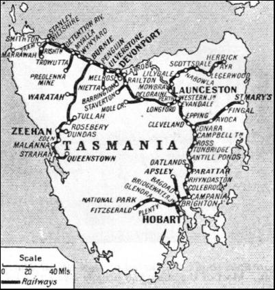 Launceston claims the honour of founding the State of Victoria. In 1834 two members of the Henty family left Launccston, then a village, crossed Bass Strait and occupied a portion of Portland Bay area with flocks of sheep. It was also from Launceston that John Batman sailed on May 12, 1835, for Victoria, and a month later steered a boat up the River Yarra and exclaimed, "This will be the place for a village" when he contemplated the site of Melbourne, Batman’s vessel was a thirty-ton schooner, "Rebecca." Batman was one of a syndicate of fifteen Launceston men who found the money to fit her out. The Fingal Line is a branch of forty-seven miles, leaving the main line at Conara Junction, running though fairly level country under the foothills of the Ben Lomond Range and following for a while the valley of the beautiful South Esk River. The line ends in a coal-mining area at St. Mary’s Station, from which a motor-car service connects with the North-Eastern Line at Herrick. The North Eastern Line extends eighty-five miles from Launceston, through forests and along hillsides to serve agricultural, dairying, timber, and mining areas. There is a large apple and pear orchard at Lilydale Station, and this and the Blidestowe Lavender Estate attract tourists. The line goes on through the town of Scottsdale and ends at Herrick. The Western Line runs from Launceston for 168 miles to Stanley, serving the principal agricultural area of Tasmania. It crosses a number of rivers and touches a score of towns, and reveals farming areas that are a delight to sightseers. Some of the towns passed in the first forty-five miles are particularly English in appearance, having rivers running through them, and streets planted with oaks and pines. A branch line runs off at Lemana to the Mole Creek Caves area, which is famous for its scenery. After crossing the River Mersey the line reaches the coast and runs within sight of the sea for about fifty miles, traversing an area of rich agricultural land between the mountains and the sea. Several short branch lines strike inland to serve farm, timber, and mineral areas. The Emu Bay Company’s Line runs from Burnie, on the north-west coast, southwards to Zeehan, for eighty-eight miles. From Zeehan a Government line of thirty miles links it with the port of Strahan, and bridges the gap between the Emu Bay Company’s Line and the Mount Lyell Line. From Burnie the railway climbs steadily, affording backward glimpses of the sea over a foreground of farms. Then the line plunges into the forests, and winds round mountain ranges crossing the Pieman River over a high bridge, the view of the Murchison Range from near Rosebery being especially fine. From Guildford Junction a branch line runs to the town of Waratah, the home of the Mount Bischoff Tin Mine. Another branch line runs off from Farrell to Tullah, a mining town in a picturesque setting among the mountains. Zeehan, the terminus, was once a rich silver-mining town, but its prosperity has declined. The Mount Lyell Mining Company’s Line, over twenty miles long, runs from the port of Strahan to Queenstown, where the mine known as Mount Lyell is situated. This mine produces copper, silver, and gold. The line is remarkable for the views its affords, as it follows the gorges of the Great King River, giving vistas of awesome canyons and magnificent forests of beech trees, with grass-trees, ferns, berries and wild flowers in profusion. Queenstown is hemmed in by mountains. Haulage lines in connection with the great mine run up the faces of mountains, giving wonderful panoramas. Although these private railways are little known, they are relatively of considerable importance. The Emu Bay Company’s Line, for instance, has 104 miles of track open, owning some dozen locomotives, and it is worth remembering that from such small lines the worlds railways grew up