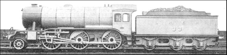 The "Decapod," as it was called from the ten-coupled wheels on which it was carried, was the outcome. It was the first locomotive ever built in Great Britain to have ten wheels coupled. Moreover, apart from early experiments in 1846 and 1868, it was the first locomotive to be built for a British railway with propulsion by three high-pressure cylinders, in the fashion which has since become so popular on three out of four British groups. In many ways, indeed, this locomotive, numbered 20 in the G.E.R. books, was a unique machine. A boiler 5 ft. 3 in. in diameter was provided, with a wide firebox spread across the frames in the manner which later became familiar on the Great Northern "Atlantics." This firebox had a grate area of 42 sq. ft.—more than that of one of the L.N.E.R. "Pacifics"—and the boiler, which carried a working pressure of 200 lb. per sq. in., had a total heating surface of 3,010 sq. ft. The three cylinders were each 18-1/2 in. in diameter by 26 in. stroke ; the outside cylinders drove the third pair of wheels, and the inside cylinder the second pair, by means of a forked connecting rod which completely enclosed the leading coupled axle. To keep the weight within limits, the engine had no side tanks, but space was found for 1,300 gallons of water in tanks carried between the frames in front of the firebox, and under the coal bunker. Two sets of safety valves were provided, one over the firebox, and another over the rear ring of the barrel. Another novelty was the automatic sanding gear, which came into operation automatically with the opening of the regulator, and applied sand by compressed air to four of the wheels. For the purpose of testing the acceleration of the locomotive, a special timing plant was laid down near Chadwell Heath, and here a series of trials was carried out. The "Decapod" was completely successful. The aim was to attain thirty miles an hour in thirty seconds from the dead start, with a load of 300 tons. In the event a train of eighteen four-wheeled coaches was made up, weighing in all 335 tons. Despite a strong side-wind. No. 20 beat the desired acceleration of 1.40 ft. per second per second of acceleration from rest, thus attaining thirty miles per hour in a shade under thirty seconds from the dead start, and with a train of over the specified weight. In consequence the G.E.R. was able, successfully, to oppose the Bill for the tube, which was defeated in Parliament, and to show that when the demand rose the Great Eastern would be equal to the occasion.
