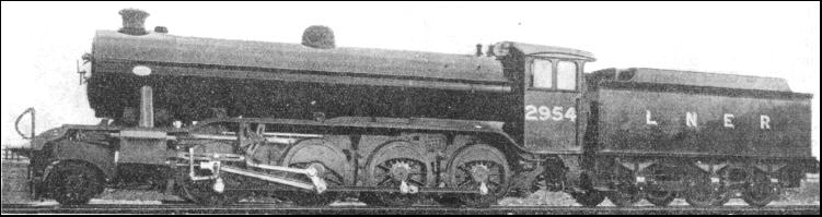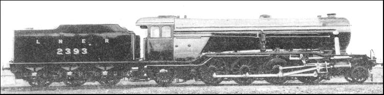 With the sole exception of the 2-8-0 + 0-8-2 L.N.E.R. "Garratt" articulated locomotive used for banking on the 1 in 40 gradient between Barnsley and Penistone (Yorks), Nos. 2393 and 2394 are the most powerful freight locomotives in Britain. They have boilers containing 2,930 sq. ft. of evaporative heating surface, and 525 sq. ft. of super-heating surface ; the firegrate area is 41-1/4 sq. ft. : driving wheels are of 5ft. 2 in. diameter; and the working pressure is 180 lb. per sq. in. The tractive effort provided by the three principal cylinders at 85 per cent working pressure is 38,500 lb. But the trailing pair of wheels under the firebox of No. 2393, 3 ft. 8 in. diameter, is provided with "booster" gear, consisting of two 10 in. by 12 in. cylinders, which can . increase the starting effort up to 47,000 lb. No. 2393 weighs 100 tons in running order, and with tender 151-1/2 tons. These two powerful locomotives work coal trains of a hundred wagons, with a total weight behind the tender of l,600 tons, from Peterborough to London, in specially arranged paths, and return with "empties." .It is the problem of "stowing" trains of this length in sidings and elsewhere, when they have to be passed by faster moving traffic, that makes for difficulty in operation, and explains why no further freight 2-8-2's have been built by the L.N.E.R. The 2-8-0 engines can comfortably meet all existing demands. But if the equipment of wagon stock with the continuous brake were to become more general, and the movement of freight as a whole, coal and minerals included, were to be correspondingly speeded up, then such types as the 2-8-2 would come into their own. Such acceleration of freight working may become imperative later on, if the speed of passenger trains continues to increase. A slow-moving freight train occupies an inordinate share of the running lines in the course of its leisurely progress, and lines congested with freight trains are the most difficult of all over which to arrange high-speed passenger paths.