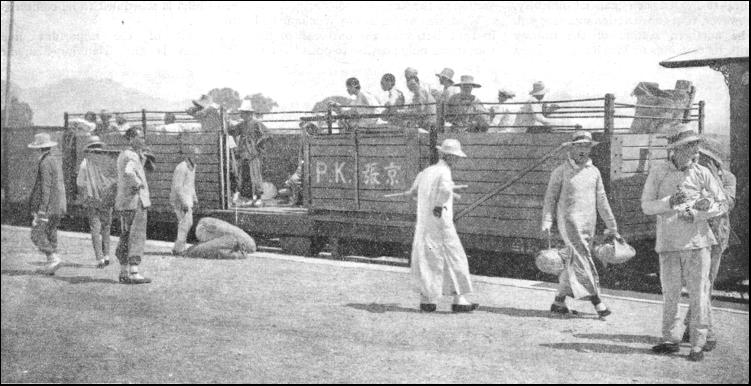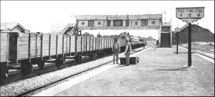 In July 1933 work on the railway between Lochang and Chuchow was pushed forward vigorously, and the final link between northern and southern China is scheduled to be completed in 1936. Another of the important lines in China is the Nanking-Shanghai Railway, which serves the Yangtze Valley. This railway was built by British engineers, and is 193 miles long. A branch line from Shanghai, on the Wangpo River, links the town with Woosung at the junction of the Wangpo with the Yangtze. The building of this branch line, its destruction, and revival provide an interesting story. In 1865 it was proposed that this line should be built ostensibly as an object lesson to the Chinese in the construction and running of railways. The scheme was strenuously opposed, and had to be abandoned. Local interests, however, demanded a railway, and to overcome Celestial objections, a British company, Jardine Matteson & Co., obtained a concession from the Chinese Government to build a "road" along the proposed route. Land purchase for the scheme used up most of the Woosung Road Company's capital, but in 1875 it was decided that a narrow-gauge (2 ft. 6 in.) railway should be laid on the "road," to be worked by small engines. At the beginning of construction, early in 1876, the Chinese Government protested that only a road had been sanctioned—not a railway. The construction gang's engine was accordingly stopped, but the laying of the line continued. The native workmen used hand trollies to take material to the railhead. Each trolley bore a red flag, and red flags were carried by coolies both before and behind the trolley, to ensure the highest possible factor of safety. The Chinese opposition to the use of the steam engine was withdrawn (and re-imposed) several times, but the line was finished as far as Kangwan, five miles from Shanghai, and officially opened on June 30, 1876. The remainder of the line was being laid when a Chinese was knocked down by the engine and killed. Riots ensued, and the line had to be closed. The Chinese Government, however, agreed to purchase the railway, which was reopened in December, 1876. When the final payment was made by the Chinese in October, 1877, all traffic was stopped. Shortly afterwards the rails were torn up and were shipped with the engines and carriages to the Island of Formosa, where they were dumped into the sea, A temple to the Queen of Heaven was erected on the site of the Shanghai Station.