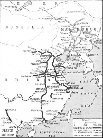 The line was first opened for through traffic on August 5, 1911. The Canton-Kowloon Railway is well equipped with modern passenger coaches and steel-sided wagons, mostly of British manufacture. One of the most important links in the whole of China's railway systems is the Canton-Hankow line. The beginning of this railway may be traced to the year 1896, when the scheme was first proposed. By 1904 an American syndicate had built a branch line from Canton westward to Samshui, a distance of thirty miles. International complications then arose, which stopped further progress until 1905. In that year local promoters raised sufficient capital to redeem the American concession. Construction of the line was then taken over by the Canton-Hankow Railway Company, and by 1915 the rails had been laid between Canton and Shiuchow, 138 miles distant. The war of 1914-18 created such financial difficulty, however, that construction was stopped. The northern section of the railway with its terminus at Wuchang, opposite Hankow, on the River Yangtze Kiang, was put into the hands of British constructors under an agreement of 1911. This contract, known as the Hukwang Railway Loan Agreement, provided for the building of a line from Wuchang to the southern boundary of Hunan, connecting with the southern section of the line. Work was begun at the Wuchang end in 1912, but, with the outbreak of the war, it was only possible to open the line as far as Changsha, a distance of 228 miles, in 1917. An extension of this line from Changsha to Chuchow due south for a distance of thirty miles was completed at the same time for the transport of coal. With the completion of the two end sections of the railway, the southern of 138 miles and the northern for a distance of 258 miles, a gap was left of 283 miles. This gap was destined to stay incomplete for a period of thirteen years, as it was found impossible to undertake the construction of a line through such extremely difficult country without adequate resources or the security afforded by settled government. In 1929, however, the Chinese Ministry of Railways decided to resume work on the section from Shiuchow to Lochang for a distance of thirty-one miles. The route of this section follows the upper course of the North River, and involves the crossing of the Nan Hsiung River by means of a steel bridge. In this section also is a tunnel 466 yards in length, one of the longest in the entire system. The Shiuchow-Lochang section was completed in September 1933, and handed over to the southern section of the Canton-Hankow Railway for operation.