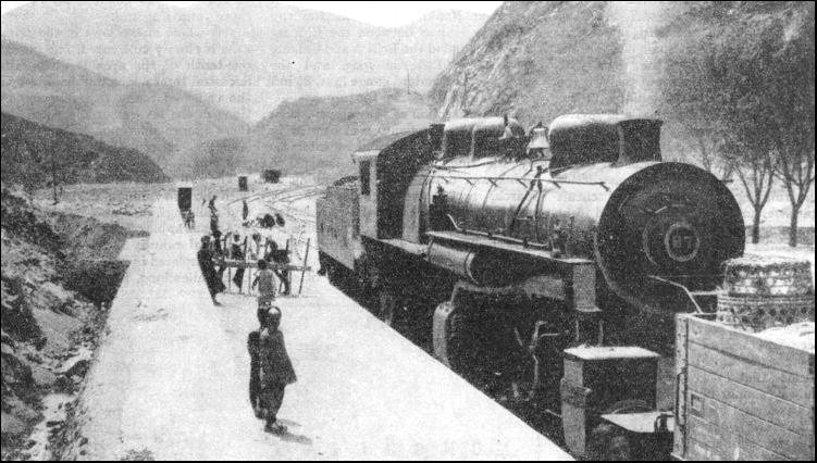 There are eleven tunnels varying in length from 54 yards to 546 yards, and 403 bridges of both steel and stone. One of the finest of the steel bridges is that over the Lo Ho, completed in 1910, and this structure has seven spans with a total length of 345 yards. French Indo-China owes its political existence to a treaty signed by the Governments of France and China on June 9, 1885. This great tract of land, covering an area of nearly 300,000 square miles, is bounded on the north by China proper, and on the east and south by the South China Sea. Indo-China forms a gateway to Central China, with its vast possibilities of trade. The French lost little time in constructing a railway from the port of Haiphong as far as Laokay on the northern frontier, bordering on the fertile Chinese province of Yunnan. This section of the railway is 240 miles long. Unfortunately, however, Yunnan comprises some country presenting great difficulty to the railway engineer. Great mountain ranges, towering 4,000 to 7,000 ft., are intersected by deep, precipitous ravines in which flow swift rivers. To overcome this great natural barrier, the French Government obtained a concession to build a railway from the frontier to Yunnan-fu, the capital of the province of Yunnan, a distance of 290 miles. The line is built to the metre gauge, and is laid on steel sleepers. Great trouble was experienced in construction, as the mountains through which the railway winds are composed of rock interspersed with layers of clay in some places. In the rainy season it was a common occurrence for great overhanging masses of rock to break away and smash the track. One of the most spectacular feats of engineering on the Yunnan Railway was the crossing of the gorge through which flows the Faux Nan-ti, a tributary of the Nan-ti River. The Faux Nan-ti is a small stream, but it runs through a canyon with walls rising almost vertically to a height of 1,200 ft. The building of the line necessitated the bridging of this chasm, a distance of 215 ft. between the opposite cliff faces at a height of 335 ft. above the stream. To gain access to the cliff faces, tunnels were driven through the rock on both sides of the gorge. The steel bridge linking the tunnel mouths is of remarkable design and construction. Two triangular-shaped girders or bascules were erected, one on either side of the gorge. These were finally lowered so that their outer ends met in mid air forming a huge inverted V spanning the gap. The track was built on a deck supported on short steel towers erected on the upper sides of the bascules. The Yunnan line was completed in 1910 after some eight years of struggle against the forces of Nature, and in the face of labour troubles, coupled with financial and technical difficulties. Another line runs from Hanoi into the Yunnan province at Lungchow. Another important line in China is the Shanghai-Hangchow-Ningpo Railway, which was built by local companies and not under a loan agreement, as were many of the Chinese railways. To carry out the building of the railway, the Kiangsu Railway Company was formed in Kiangsu to construct the line as far as the Chekiang border. For the building of the line from this boundary to Hangchow and thence to Ningpo, another company known as the Chekiang Railway was incorporated. Construction was begun in 1906 and the line was opened for traffic to Hangchow in August 1909. By 1935 the line from Ningpo towards Hangchow had been completed as tar as Pokwan. The line had also been built out from Hangchow for a short distance in the direction of Pokwan. Part of the scheme for the final linking of the line from Shanghai through Hangchow to Ningpo is a great steel bridge across the Tsiantong Kiang River, the contract for which has been placed with a British firm. Some of the enormous difficulties under which railway builders accomplished their great tasks have been outlined above, but the hidden obstacles against which railway construction was faced can be appreciated only by a knowledge of the country itself. In 1918 the Chinese Ministry of Communications began to put in hand a system of unification among the various interests in the Chinese railway world. Between the years 1917 and 1922 a careful study was made of standardization. Large numbers of 40-tons wagons, both covered and open, were constructed which could go anywhere on the Chinese lines. After the war of 1914—1918 many lines were built with Chinese funds and labour, and by the end of 1931 the original Chinese National Railways had increased in route mileage from some 3,400 to over 6,200. The establishment of the State of Manchukuo resulted in a loss of Chinese track to the extent of over 1,500 miles. Of the principal lines now serving the country the Peking-Hankow Railway has 817 miles of track, and is equipped with over 200 locomotives and over 2,000 carriages and wagons. The Peking-Liaoning Railway has approximately 840 miles of track, with 262 locomotives and nearly 5,000 carriages and wagons. The Tientsin-Pukow Railway, with 685 miles of track, has 143 locomotives and over 2,000 carriages and wagons. The Kiao-Tsi Railway, with 280 miles of track, has rather heavy traffic, despite the shortness of its route.