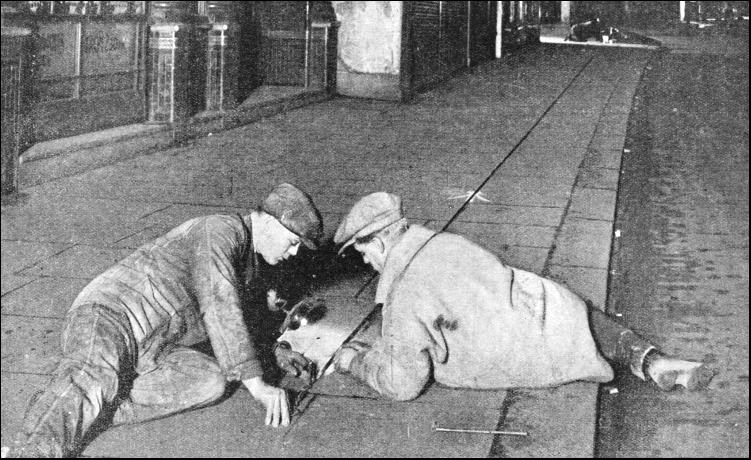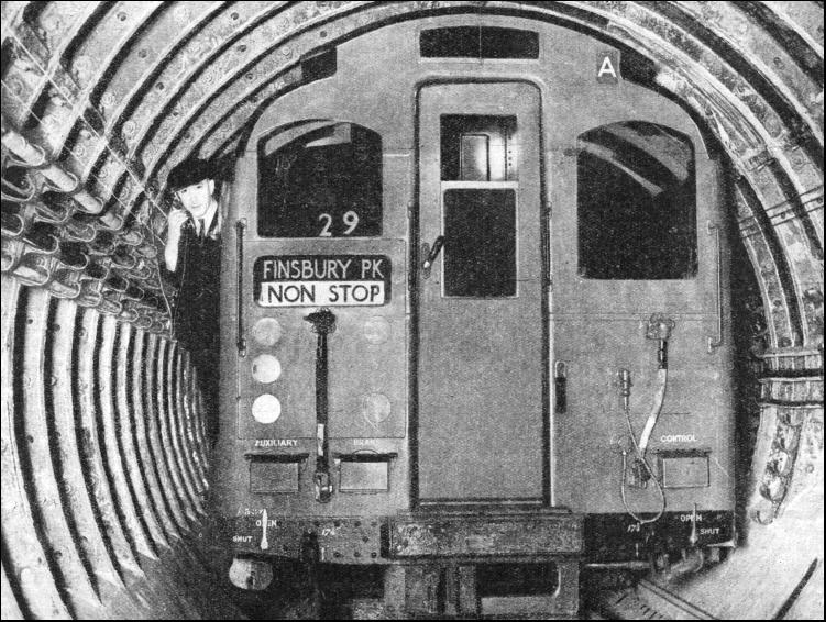 Apart from these safeguards connected directly with the operation and running of trains, there are other safety devices embodied in the construction of the Underground stations themselves. All passenger lifts, for instance, are mechanically controlled as a check on the lift operator. A safety catch ensures that a lift can neither descend nor ascend unless both the doors and the folding gates have been closed. This catch is a switch placed in the path of the door or gate and is kept open by a spring, so that no current can pass to the lift, which then cannot move. The lift can start only when the closed doors and gates have overcome the resistance of the switch's spring. The speed of the lift is regulated by a lift governor, which consists of two metal balls attached to a vertical shaft. The balls are free to revolve and move in a vertical position by centrifugal force. Should the lift exceed its speed-limit, the governor puts on a brake, causing the lift to come to a standstill. In the most unlikely event of a lift cable breaking there is a device which would open a contact switch, thus shutting off the power from the motor and instantly stopping the lift. To enable lifts to be worked automatically, and to govern acceleration and deceleration, all lifts are fitted with "landing control" gear. This gives the lift attendant sufficient time to collect tickets and to supervise passengers entering and leaving lifts, to close gates and to prevent overcrowding. Every shaft to a tube station contains cither two, three or more lifts, and if for any reason one of these should stop, another can be quickly lowered or raised until level with it. Then passengers may step out of an emergency door into the second lift and continue their journey. Few people notice these emergency doors in the tube lifts because they are usually hidden by a display of framed advertisements. The cables supporting the lifts are manufactured and tested to haul nine times the weight of a lift loaded to its maximum capacity. At each landing stage the operator can see at a glance the exact position of the lift, an indicator telling him whether it is stationary, ascending or descending. In the more recently built stations escalators have replaced lifts. These escalators have their own particular safety appliances. Occupying a conspicuous position at the top and the bottom of the moving stairway, small metal drums have been installed. Each drum has a paper diaphragm concealing a plunger. It, in the event of emergency, it is necessary to stop the escalator, the diaphragm can be easily broken through and the plunger pressed. This at once cuts off current from the escalator. Should the chain of an escalator break or should the escalator move too rapidly, a contact switch opens and stops the escalator by cutting off its power. Escalators are also provided with brakes to prevent a running back should the electricity suddenly fail. These mishaps seldom occur, but the London Passenger Transport Board, like its predecessors, leaves nothing to chance.