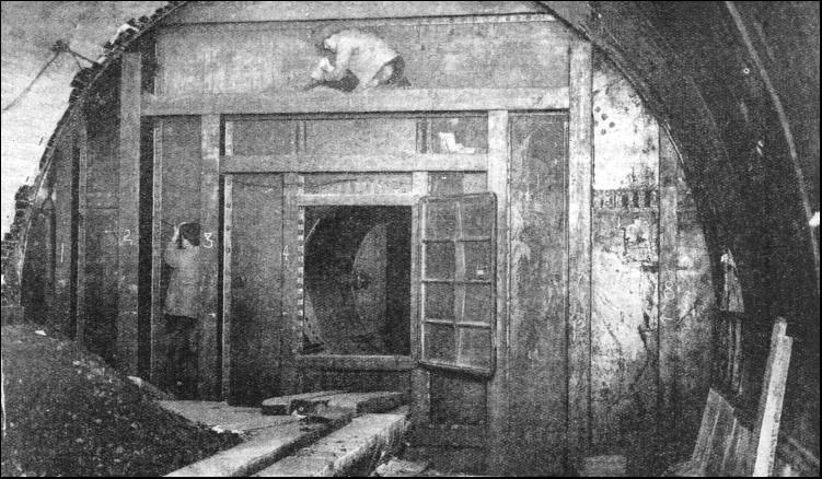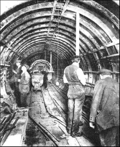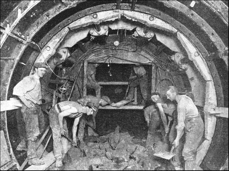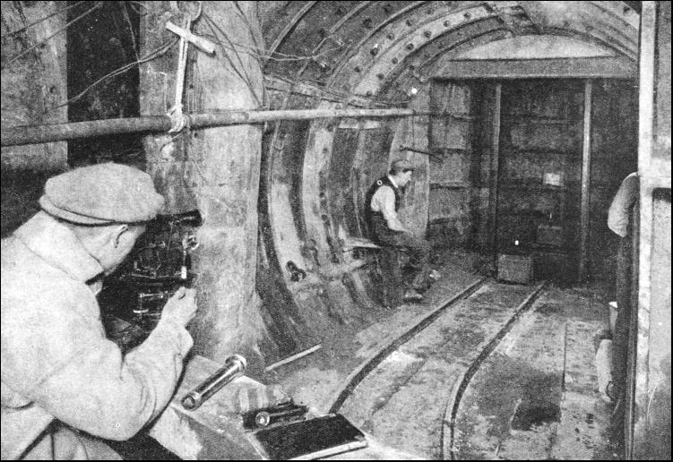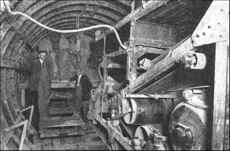 While the shield is being driven steadily forward by the rams, the course has to be constantly checked and measured off to agree with the engineer's plans and prints. This procedure is called banding, as all measurements are made with a steel tape or band which is proof against either stretching or shrinking. The position and direction of the tunnelling is checked by iron dogs or hangers fixed to the roof, set some 35 ft. apart, to which plumb-lines are attached. These hangers are set by the engineer, and the plumb-lines are adjusted in exact line with the theodolite. The position of the shield is ascertained by lowering a bar called a fiddle into place across the horizontal diameter of the shield. The fiddle top is at axis level, and in its middle is a notch denoting the centre of the shield. The workman in charge of the shield drops two of the plumb-lines, and from the farther one he sights through the leading line on to the fiddle. Another workman then puts a small piece of wood with an upright slit, which is illuminated by a candle, on to the fiddle. The man at the shield adjusts this slit until it coincides with the plumb-lines. Then it is seen how much the notch on the fiddle is to the right or left of the tunnel's centre-line, and any error in the shield's position is determined and can be rectified by altering the pressure of the various rams. When the engineer desires to check the level of the shield he has hangers bolted to the roof of the tunnel on which a movable pin is set to be on a precise level parallel with the gradient. From these movable pins, boning rods shaped like the inverted T are suspended. The true axis level of the tunnel is shown by the crossheads of the rods. The workman in the shield once more holds up his piece of wood to the fiddle, but this time with the slot horizontal. Then, taking a sight along the top of the crossheads, he signals for the piece of wood to be raised or lowered until the illuminated slit coincides with his line of sight. The position of the top of the fiddle is then noted in relation to the slit. If below the slit, the shield is low ; if above, the shield is high ; and, as before, such adjustment as may be needed is carried out by the rams. Square lines set out at right angles to the centre-lines of the tunnel, and trailing rods—divided into feet and inches, attached to each side of the shield—also serve to give accuracy. When the shield should be operating along the centre-line, the ganger must obtain equal readings on the scales of the trailing rods, for unequal readings would denote that the shield was out of line. The correct overhang of the shield, if the work is going downhill, and the correct "look-up" if uphill, are checked by a plumb-line. These precautions are taken when the shield is tunnelling on the straight. On curves the engineer provides the ganger with a number of figures which show that for every foot in advance of the front plumb-line the shield's centre should be so much to the right or left of the working lines.