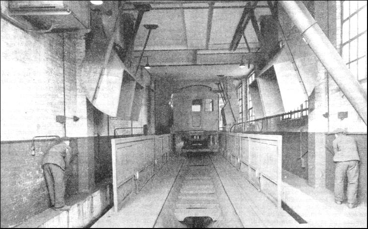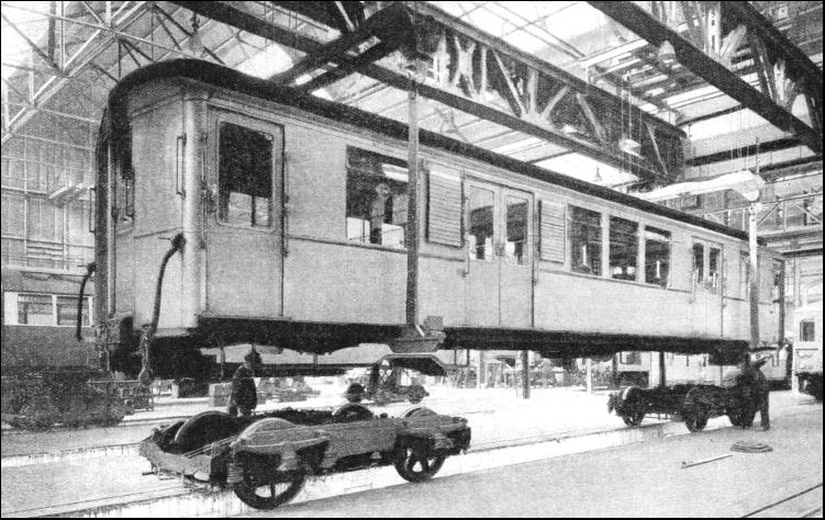 The overhaul work is divided into five chief sections—the lifting shop, the truck shop, the car body shop, the paint shop, and the wood shop. The total covered area is about 207,000 sq. ft. The main building, which houses the truck, car-body and paint shops, measures 400 ft. by 375 ft. Wherever practicable machinery and tools are brought to the work on hand, not the work to the machines. Each section of the work is a machine-shop, and, except that it depends on a small shop for a few supplies, is self-contained. When cars are sent to Acton for overhaul, they enter the works in the lifting shop. The complete body is then taken from its running wheels and put on to the accommodation or workshop bogies, which are waiting on a nearby track. The haulage chains already mentioned, are fixed to the service bogies and carry the load on to the truck shop. When the trucks of the car bodies have been inspected and, wherever necessary, repaired, they are dispatched to the truck storage building until wanted for reassembling. After the car body has been put on the accommodation bogies, all the seat cushions and seat backs are removed, taken to the seat-trimming section, and cleaned. Meanwhile, the car bodies themselves are being cleaned in a "blowing-out" enclosure. The car body is drawn into this by an endless chain. There the accumulated dust and dirt are swept off by compressed air. The enclosure has a special draught-producing apparatus which deals with the underframe of a car and the electrical equipment. The draughts are created by compressed air jets. In the roof of the "blowing-out enclosure" powerful fans can be brought to bear on to the motors of the tube cars. After cleaning, the car-body has to be taken to the dismantling section of the car-body shop. At the entry to this section a general and thorough test is made of the electrical circuits for power, control, lighting and heating. The test occupies an hour, and the car is kept stationary while this takes place. All the circuits are first tested for continuity. Then 2,500 volts A.C. is applied to power line cables, and 1,250 volts A.C. for one minute to all other circuits. Readings of resistance are taken afterwards and recorded for the use of the overhaul authorities. The car is then taken along farther by another haulage chain, and eventually transferred on to a car-body assembly-conveyer ; if any defect that cannot be dealt with in this time is discovered, it is passed on to another and smaller shop, which can handle only two cars at once. When the car has been finished with on the assembly conveyer, it is taken, by means of haulage, to the paint shop. When repainting has been carried out, the car body returns to the lifting shop. Here it is raised again and put back on to service bogies. Twelve cars can be dealt with simultaneously, as there are four separate tracks each having three pits over which the bogies rest. Before the crane—a "65 ft. span, 30-ton duplex" of special design—lifts the car body from the accommodation bogies, a swift but careful inspection is made to ensure that everything has been correctly repaired or adjusted. When the crane has raised the car off the accommodation bogies, they are removed and replaced by service bogies. After that seat cushions and backs are re-installed. Then the brakes and electrical gear are put in order. The car is now ready for the running track again and is moved away to train sidings to await return to service.