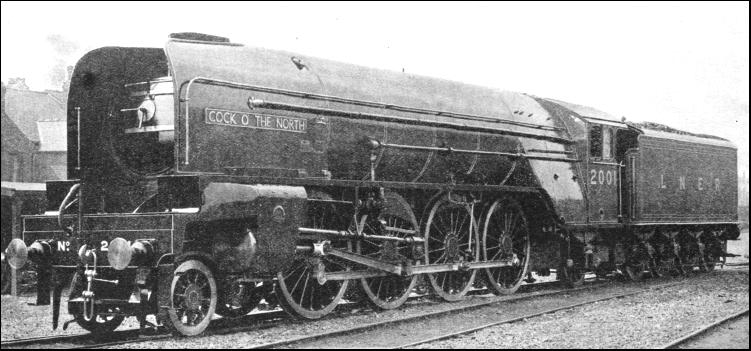 All these arrangements so facilitate the passage of the steam that the engine is capable of doing high-speed work with heavy trains at no more than ten per cent cut-off—that is to say, steam is admitted for one-tenth of the stroke only, and for the remaining nine-tenths does its work by expansion. One result of this ultra-short cut-off working is that the pressure at which the steam is finally exhausted is very low, and there would be a tendency for it to drift along the top level of the boiler and obscure the front windows of the driver's cab, were special precautions not taken to prevent this. It is here that the external casing at the front end of the engine, with its wings on either side of the smoke-box, serves both as streamlining and also to make a strong up-current of ail when the engine is running at speed, which lifts the exhaust steam from the double chimney, and carries it well clear of the cab. The cab-front also is V-shaped, to assist in the streamlining effect, but, despite the enormous size of the boiler, there is an excellent look-out ahead. Inside the external boiler casing there is found another aid to efficiency in the feed-water heater, of the A.C.F.I, type, which uses some of the exhaust steam in order to heat up the feed-water on its way from the tender into the boiler. This means that less heat is required inside the boiler to convert the feed-water into steam. A novelty is provided in the shape of a chime whistle in front of the chimney, which was the only convenient place in which it could be put. The tender is of the standard L.N.E.R. eight-wheeled type. "Cock o' the North" is the heaviest locomotive built, up to the time of writing, for passenger service in Great Britain, and weighs 110-1/4 tons in running trim ; with the tender the total weight is 165-1/2 tons. Shortly after the "Cock o' the North" had emerged from Doncaster Works, a test run was made, with a train weighing 650 tons, from King's Cross to Barkstone, just beyond Grantham, and back. The long gradient to Stoke Summit, partly at 1 in 200 and partly at 1 in 178, was surmounted at an average speed of a mile-a-minute for the whole distance, and without speed at any time falling below 56 miles an hour. The engine developed at the draw-bar the hitherto unprecedented figure for Great Britain of 2,090 h.p. Whether we like it or not, locomotive fashions are fast altering. Both internally and externally revolutionary changes are being made, and from recent developments—of which the "Cock o' the North" is only one example—it is clear that we must accustom ourselves to locomotives unlike those which have become familiar. Those who lament the radical external changes in locomotive design sometimes forget that higher and even higher speeds are being called for in this hurrying age. The greater the speed the more potent is the resistance of the air through which the vehicle passes. Streamlining has become essential for all vehicles designed for rapid motion, and we must expect, therefore, that streamlining should be extended to the steam locomotives of the future. It is not the aim of the designer merely to obtain higher speeds. If he can lessen the resistance at high speeds coal consumption will be reduced, and efficiency will be increased proportionately. The "Cock o' the North" is one of the heralds of the new order of things in the locomotive world.