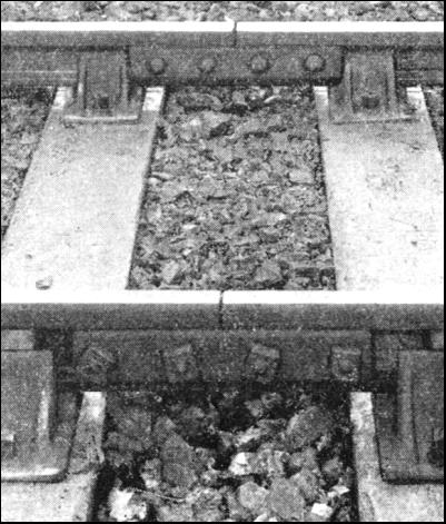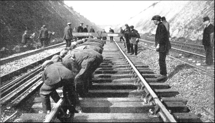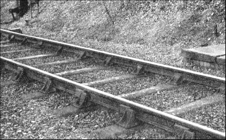 As better methods of handling have been devised, both at the manufacturers' works and at the railway depots and the line-side, so rails have grown in length. The earliest steel rails were mostly 24 ft. or 30 ft. long ; since then they have grown progressively to 36 ft., 45 ft., and 60 ft., the last-named being now the general standard in Great Britain. For special purposes 90 ft. rails are used, such as across level-crossings or bridges, where it is desirable if possible to dispense with rail-joints. America is behind Great Britain in this matter, most American rails being 33 ft. or 39 ft. long. But on the continent of Europe 24-metre rails (78 ft. 9 in.) are common, and Germany specializes in 30-metre rails (98 ft. 4 in.). The Germans also do a great deal in these days in the matter of welding rails together into long continuous lengths. Hitherto it has always been considered essential to keep the lengths of rails down to a reasonable figure ; and to leave between them an expansion space at a normal temperature of 1/4 in., to allow for the expansion of the rails in hot weather. When temperatures have been extreme rails have often buckled out of shape, and caused derailments of trains, owing to the rails having expanded to a greater degree than permitted by these spaces. But it has long been the practice to weld tram rails together in continuous lengths ; tram rails, of course, are buried, only the top of the head showing above the road metal, so that they do not respond to temperature changes so much as the railway rail, but they are also very tightly held and unable to buckle in consequence of expansion. The same principle is therefore being applied to railway rails in Germany, and welded continuous lengths up to 90 metres (295 ft.) are becoming common. The most startling experiment in welding has been carried out in the Brandleite Tunnel, where the rails have been welded together in both tracks throughout practically the whole length of the tunnel, which is all but two miles long. At a central depot the 30-metre rails were welded in triplets into 90-metre lengths, and, despite their length, were transported on wagons for some distance over the main line. (Rails are considerably more flexible than might be imagined, and the precautions taken in loading were sufficient to enable the wagons so loaded to pass over cross-over lines.) The final welding was carried out on the site, and in this tunnel there are now four rails, which are continuous for a distance of 2,640 metres. Welding the rails together reduces the number of fishplates, but this is not the only reason that rails are being lengthened. The rail-joint is the weakest point in the track, and as the number of joints is reduced the cost of maintaining the line is lowered, and the riding of the trains is improved. It is the gap in the rails at the joint that gives the trouble. Inventors have devised new types of rail joint by the hundred, but none has solved the problem. The most obvious solution to the problem seems to be that the rails should be cut at the ends on the skew instead of on the square ; this has been tried, but it makes very little difference. The principal weakness of the joint is that the rail-end off which a wheel is running bends downwards under its weight, and the wheel then runs on to the level end of the next rail ahead, tending all the time by these impacts to drive the rails forward ; and, almost imperceptibly, the rails do very gradually move forwards. The phenomenon is called "creep," and at some locations is very troublesome. From time to time the rails have to be pulled back to their normal positions. Lately in Great Britain the problem of the joints has been simplified by cutting the fishplates (which join the rails together) from 18 in. in length down to 10 in., and securing the rails by one bolt at each rail-end, instead of by two ; this enables the adjacent sleepers to be brought much closer together, so that the joint has considerably better support than before. The bull-head rail rests in cast-iron chairs, which, in standard British practice, weigh 46 lb. apiece.