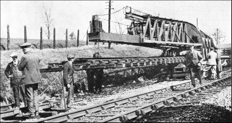 In these days a certain amount of track relaying, and much pioneer track-laying, is done by special track-laying machines. When these are in use for relaying purposes, the preliminary operations on the site are confined to removal of the ballast and unscrewing the fishplates ; the machine then lifts complete lengths of track—rails, chairs, and sleepers as one unit—and drops new units bodily into position. These new units are stored on flat wagons behind the track-layer, and by an ingenious conveyer arrangement are brought forward from the train to the projecting crane-arm of the track-layer, while the lengths of old track are similarly passed down the train to the wagons for removal. A track-layer can operate at a speed of 240 yards of relaid track per hour, which is a considerable advance on ordinary manual methods. Last of all, mention must be made of the method adopted for testing the condition in which any given length of track is being maintained. This is done by means of the Hallade machine, which is carried in an ordinary coach, and by a system of damped pendulums causes a pen to inscribe on a roll of paper, which is being slowly rotated by clockwork, an exact picture of the oscillations of the coach during the test journey. These records enable the engineers to see exactly where joints require packing up, or curves re-aligning. The Great Western Railway goes even farther than this. A special bogie coach has been adapted for this track-recording and makes periodic journeys at the rear of ordinary express trains over all the main lines. Not only is a Hallade recorder carried in it, but the coach is equipped with automatic apparatus, the function of which, whenever one of the coach bogies moves by more than a predetermined amount in relation to the body of the coach, is to drop a splash of whitewash on the track at the very point where this excessive oscillation occurs.