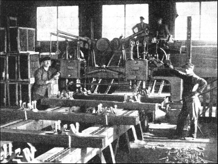 The rail seat of the chair is rounded to a radius corresponding with that of the underside of the rail-foot, which is 12 in. The jaws hold the rail tilted slightly out of the vertical ; this tilt, which is l in 20, is for two reasons. It holds the centre-line of the rail exactly at right-angles to the face of the wheel-tyre, which is coned ; and it also ensures that the rail will be safely in position even though all the keys should be out throughout its length. The flat base of the chair helps to distribute the weight of the trains over as large an area of the sleeper as possible, and the life of the sleeper is further preserved, and the running of the trains is quietened, by the interposition of a felt pad between the chair and the timber. Three large galvanized screws, each weighing 1-1/2 lb., secure each chair to the sleeper, except on the Great Western Railway, which uses two bolts passing through the sleeper, and held on the underside by fanged washers that bite into the timber, The supply of timber for sleepers is a problem. Most of the sleepers used on British lines come from the countries bordering on the Baltic, and are of fir, 9 ft. long by 10 in. wide by 5 in. deep. Before use they require creosoting as a protection against rot, and for this purpose each sleeper is made to absorb from three to six gallons of creosote oil.