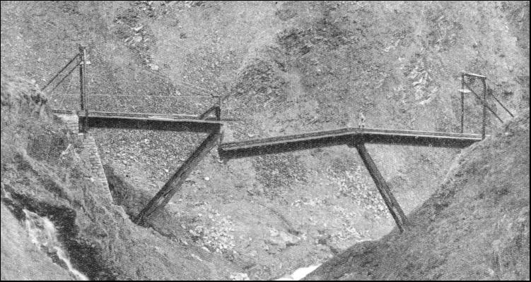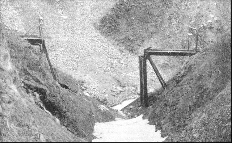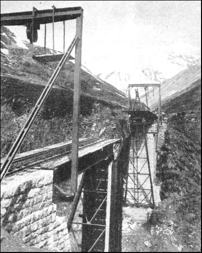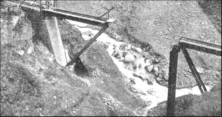 But the avalanche protection is not confined only to the immediate vicinity of the line. If the passenger over the Lötschberg were to climb some of those formidable slopes above the line, in the Lonza Valley, he would find what might appear to him to be the remains of early Swiss fortifications, resembling isolated sections of the Great Wall of China. All these short masonry walls are related to the railway below. They have been erected at strategic points all over the mountain-side. In their irregular battalions, like a whole series of breakwaters, they check the force of the masses of sliding snow before they get down to the level of the railway. Shortly after the war the Furka-Oberalp Railway was opened to connect the valley of the Rhône with that of the Rhine, along the great central cleft of Switzerland which is so prominent a feature of any contour map of that country. Its name is taken from the two high passes, the Furka and the Oberalp—over which it passes on its journey from Brigue, at the mouth of the Simplon Tunnel, through Andermatt to Disentis, in the Canton of the Grisons. The former of these passes, at the level of the tunnel which pierces its crest, is 7,100 ft. above the sea-level, and the latter is 6,720 ft. As the traffic carried by this line is, for the most part, only summer tourists, the expense of protecting the line from drifts and keeping it clear from snow throughout the winter would not be justified. Thus, except for traffic up the valleys at the two extreme ends of the line, and for trains run for ski and toboggan enthusiasts from Andermatt up to the Oberalp Pass during the winter-sport season, the Furka-Oberalp Railway is closed to traffic. After an emergence from the Furka Tunnel at the east end, the railway comes out into the upper end of the Reuss Valley, and has not proceeded more than half a mile when it has to cross a lateral gorge, down which there flows the Steffenbach, a tributary of the Reuss. Owing to the configuration of the mountains above, the Steffenbach ravine is a notorious centre for avalanches throughout the early part of the year. Massive, swift, and destructive avalanches they are, too ; so much so that in the spring after the Furka-Oberalp Railway had first been opened, the bridge carrying it over the Steffenbach gorge was swept completely away. A new and a stronger structure was then erected ; but Nature playfully repeated her tricks in the following spring, and once again the Steffenbach gorge was without a bridge. It was distinctly tiring to have to put up a new bridge every summer, and the engineers of the line determined to get the upper hand. The Steffenbach's necessity proved the mother of invention, and the Furka-Oberalp engineers designed a unique bridge which takes to pieces and packs away for the winter. They can now view all the vigorous activities of Nature at this particular location with the utmost unconcern. The bridge lies at a considerably higher altitude than any of the lines previously mentioned, and at a very inaccessible spot.