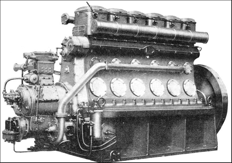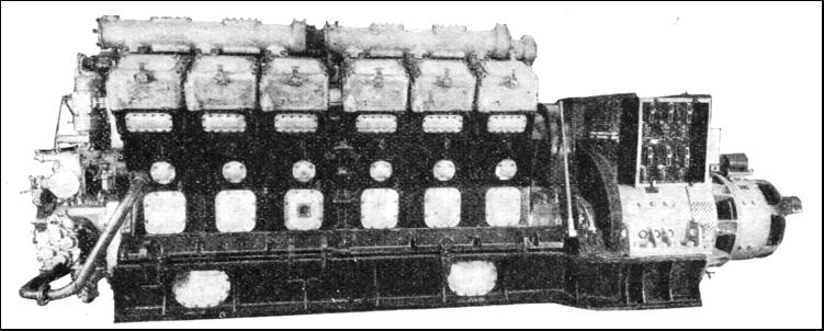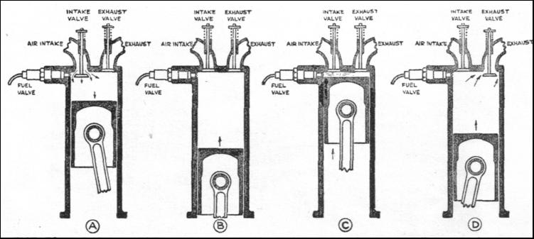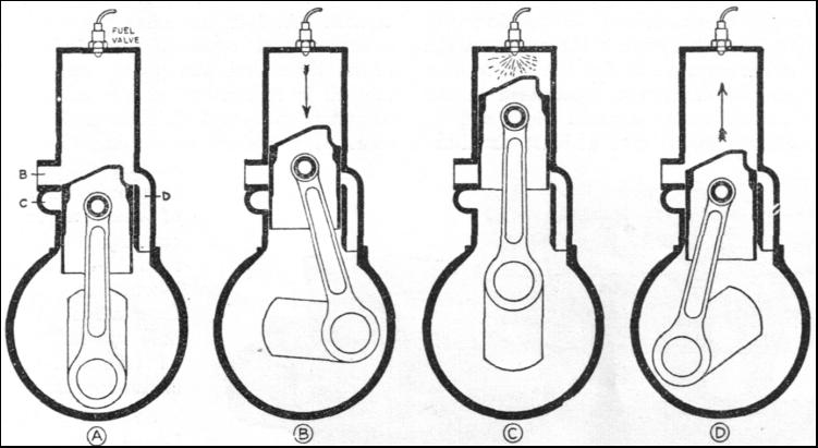 Usually, during the combustion process the pressure rises to 800 or 1,000 lb. per square inch. This high pressure forces down the piston, while the highly-heated gases, which are the products of combustion of the oil and air, experience an expansion effect which results in a downward power stroke. The next upward stroke of the piston is used for clearing the burnt gases out of the cylinder through an opening known as the exhaust port. Normally this is closed by the exhaust valve, but during the gas-clearing or exhaust stroke this valve is arranged to open. When the piston gets to the top of its exhaust stroke the exhaust valve closes, but at this moment another valve opens, uncovering a passage leading direct to the open air ; this is known as the air inlet valve. As the piston moves downwards once more the suction effect created causes the air from outside to flow into the cylinder, until the latter is completely filled with air at the same pressure as that outside, namely, atmospheric. After this, while the piston is at the bottom of its stroke the inlet valve is closed by suitable mechanical means, the exhaust valve still remaining closed. We have thus arrived at a similar state to that begun with, and the air is ready for its compression stroke ; the cycle of operations is now complete. It will be seen that each consecutive working cycle of the Diesel engine is made up of four working strokes, these—in their respective orders—being (1) compression ; (2) combustion and expansion ; (3) exhaust, and (4) suction. Owing to the fact that four strokes, or two revolutions of the engine are necessary to complete the cycle, this type is known as the four-cycle engine. There is only one working, or power, stroke in the four strokes that make up this cycle, the other three being non-productive. To overcome the somewhat jerky or erratic nature of the working, it is usual to fit the engine crankshaft with a flywheel. If the engine has only one or two cylinders a larger flywheel will be necessary than for engines having four or more cylinders. The object of the flywheel is to store some of the surplus energy from the power stroke and to give this energy out again for the three non-productive strokes. In the Diesel engine the time taken by each cycle is very short ; thus the complete cycle occupies only about one-twelfth of a second in the case of an engine operating at 1,500 revolutions per minute. There is another type of Diesel engine possessing advantages over the four-cycle one described. This is known as the two-cycle engine, from the fact that each working cycle occupies only two strokes, or one revolution of the engine. In this engine the exhaust and suction strokes, performed by the piston in the four-cycle engine, are dispensed with, so that the piston is used only for the compression and combustion-expansion strokes. The general method of accomplishing this is to arrange for the piston when moving downwards on its expansion stroke to uncover near the bottom of its travel—a port or ports cut through the cylinder walls. When thus uncovered the expanded burnt gases can escape into the exhaust pipe. When the piston moves down still farther, and is practically at the bottom of its stroke, it next uncovers another port or set of ports, thus allowing a charge of fresh air to be forced through these ports under pressure into the cylinder. As the piston moves upwards on its next stroke, it covers the inlet and exhaust ports, and then proceeds to compress the new air charge to the same high compression pressure as in the four-cycle engine. Near the top of this stroke fuel is injected and combustion takes place, followed by expansion of the hot combustion products during the ensuing expansion stroke : the cycle of operations is thus completed.