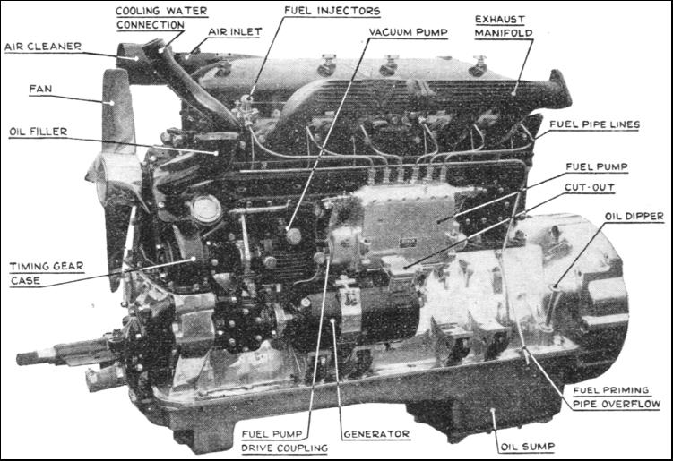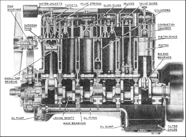 Fortunately, intensive scientific investigation has led to the causes of both of these troubles being discovered. As a result, new designs of combustion chamber have more recently been evolved which entirely overcome these drawbacks. This statement will be appreciated when it is mentioned that at present there are several hundred motor-buses running through the London streets fitted with modern high-speed Diesel engines, and the public is quite unable to distinguish them from the ordinary petrol engine buses. One seldom, if ever, experiences the exhaust or thumping noises associated with petrol engines. Although this type of engine owes its inception to the inventive genius of an Englishman, Herbert Ackroyd-Stuart, its subsequent development by a German, Dr. Rudolf Diesel, has led to the association of the latter's name with this class of internal combustion engine. The Diesel engine differs from the steam engine-boiler type in that it burns its fuel in a compressed air charge within the cylinder itself. In the steam locomotive the fuel is burnt much more wastefully in the firebox of a boiler to convert water into steam, the latter being admitted into the cylinder of a steam-engine working at lower pressures and temperatures. Whatever type of engine is used, the higher the working temperatures and the average pressures in the cylinders or chambers of the engine, the greater will be the proportion of the fuel's heat available for useful work in the form of horse power. It is for this reason that modern steam engines of the reciprocating and turbine types endeavour to use high temperature—or superheated steam—and high boiler pressures. The Diesel engine is particularly efficient in this way, for it attains much higher temperatures and pressures from the combustion of its fuel than is possible with the steam engine. The fuel used for modern Diesel engines is a moderately viscous heavy oil derived from the distillation of petroleum, known as Diesel oil. This fuel is heavier and has more "body" than either petrol or paraffin, yet will readily flow through small pipes.