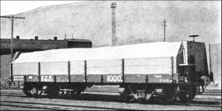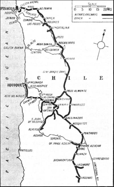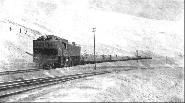 Another line of the system goes from Monte Caseros to Corrientes, capital of the province of that name near the confluence of the Rivers Paraguay and Paraná, and 750 miles from Buenos Aires. French enterprise also has contributed to the railway development of the country, the principal French company being the Province of Santa Fé Railways, which owns over 1,250 miles of metre-gauge lines. The Argentine State Railways control 5,764 miles of lines varying from the broad gauge to 2 ft. 6 in., the principal line being the metre-gauge Central Northern, which serves the country north and west of Cordoba. The Patagonian line is broad gauge, and runs west from the port of San Antonio to Bariloche, the mileage being 469. Chile is an extraordinary country geographically, as it consists of a ribbon of land from between sixty and 180 miles wide running down the Pacific Coast of South America for about 2,800 miles, from the tropics to stormy Cape Horn, and affording a striking variety of altitudes and temperatures. For a great part of its length it is hemmed in on the east by the mighty Andes. It is bounded on the north by Peru and on the east by Bolivia and Argentina, the Pacific Ocean forming the western boundary. The area is about 289,810 square miles, and the population at the 1930 census was about 4,287,000. The language of the country is Spanish. British railway enterprise has played an important part in the development of the country, and particulars of the largest British line, the Antofagasta Railway, are given on the page "The Magic of the Andes." as stated earlier in this chapter. The oldest nitrate-carrying railway in Chile is the Nitrate Railways Company, which is British, and operates some 400 miles of 4 ft. 8-1/2 in. gauge track in the province of Tarapacá, the most northerly province of the republic. This system carries passengers as well as nitrate, and connects with the principal trunk lines. When the railway system in the province of Tarapacá was begun about the year 1865 the territory was Peruvian, but, after the war between Chile and Peru and Bolivia in 1883, the provinces of Tarapacá and Antofagasta were ceded to Chile. The deposits of sodium nitrate are found only in north Chile, and the primary purpose of the railways was to bring the nitrate expeditiously to the coast, since the progressive increase in the exportation of nitrate and soda had made it apparent that the transport of the commodity by mule carts, a method which had existed since about the year 1830, was no longer adequate for the needs of this industry. At one time these nitrate deposits made Chile one of the most important countries in the world, as nitrates are essential for the production, among other things, of high explosive and fertilizers; but since the war of 1914-18 methods of producing synthetic nitrates have been invented by scientists, with the result that the whole economic position of Chile has altered.