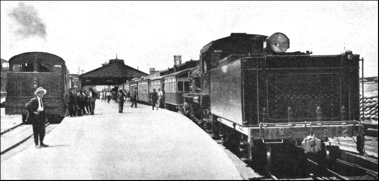 The issued capital of the Southern is more than £72,000,000, and it is one of the most notable examples of British railway enterprise in South America. The Buenos Ayres Western Railway operates west of the capital between the zones of the Great Southern and of the Buenos Ayres and Pacific Railway. The system extends in the direction of the Andes across an agricultural and cattle country to the vine and fruit region of the province of Mendoza. It has the distinction of being the oldest railway in Argentina, as it includes the first line, opened in 1857, between Buenos Aires and Flores, a distance of six miles. In those days Flores was a separate town, but it is now in the centre of the municipal area of Buenos Aires. This line decided, in a curious way, the gauge question. The equipment was made for use in India for the broad gauge there, but when the Crimean War broke out in 1853, the lines and rolling-stock were shipped to the Crimea. After the war they were bought by the railway pioneers of the Argentine to solve their transport troubles in crossing the low-lying country at the back of the capital. The first locomotive was a veteran of the siege of Sebastopol, and was named "La Porteña," when it arrived. The original rolling-stock consisted of this locomotive and one other, live coaches, and a few goods wagons. No fewer than 15,000 passengers were carried in the first fortnight, and the line was such a success that within less than a year two more locomotives, forty wagons, and a "super" carriage to seat sixty passengers were ordered, fares were cut, and monthly tickets were issued. Thus the Crimean War, now half forgotten except by historians, accidentally decided the gauge of the railways of the vast republic of Argentina. It is also a curious coincidence that the 5 ft. 6 in. Indian gauge is also the gauge of Spain, the mother country of Argentina. Another British line is the Entre Rios Railway, which operates in the province of that name, which means "Between Rivers," and is bounded by the rivers Parana and Uruguay. The mileage is 810, and the gauge 4 ft. 8-1/2 in. This line does not run into the capital, but is linked with it by a ferry-boat service from the river port of Ibicuy, on the Paraná, to Zarate. Zarate is fifty-six miles from Buenos Aires on the Central Argentine Railway. The Entre Rios system extends north to Concordia, on the right bank of the Uruguay River, the chief town in the province, and links Concepción del Uruguay with Paraná, the capital of the province, which is on the Paraná River, and is 364 miles from Buenos Aires. This line is worked under one administration with the Argentine North Eastern Railway, the offices being at Concordia. The North Eastern operates 753 miles of 4 ft. 8-1/2 in. gauge. This British company made an effort in the early days to install the standard gauge in Argentina, and succeeded. The original concession granted in 1864 for a line, now forming part of the system, was for the broad gauge, but the railway company persuaded the Government to alter the gauge to standard, as the lines in the neighbouring countries of Uruguay and Brazil were of standard gauge. The system is part of the through route from Buenos Aires to Ascunción, the capital of Paraguay. It goes north from Concepción del Uruguay and Concordia to Monte Caseros and on to Posadas, on the Paraná River opposite the town of Villa Encarnación, in Paraguay. From this point trains go to Asunción.