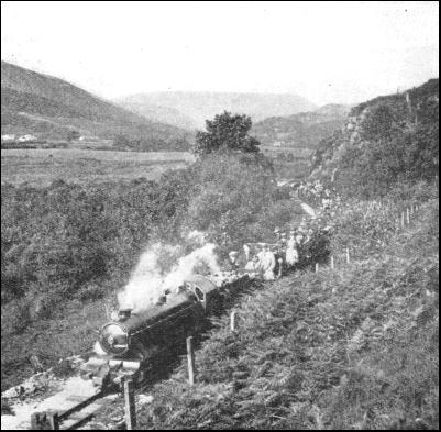 The Eskdale line was originally built as a 3-ft. gauge railway. It went out of use, but since the war its activities have been revived as a 15 in. gauge passenger railway. The original line was operated because of the iron ore found in the hills at the foot of Sca Fell. When the iron ceased to be worth mining the small amount of passenger traffic was not enough to make the line pay, with the existing type of rolling stock and engines. The attraction of the new miniature express locomotives, however, brought hundreds to see the line and take a trip up the picturesque valley to Dalegarth almost every fine day during the summer months. The miniature locomotives were speedier than the lumbering old contractor type of engine used in the 3-ft. gauge days, and more pleasing to the eye. The line, in its miniature railway form, runs from the coast, the terminus station adjoining the L.M.S. main station at Ravenglass, a village which was once a Roman port. At the re-opening the railway was run on the old permanent way material, the spikes being lifted and the rails drawn in to the new 15 in. gauge. The railway has since been relaid with new rails and sleepers specially designed to suit the 15-in. gauge express engines. The other end of the line, Dalegarth, is at the foot of Sca Fell, England's highest mountain, which is on the road to Hardknott Pass. From Ravenglass the railway rises, steeply in places, nearly 200 ft. in the seven miles run to Dalegarth.