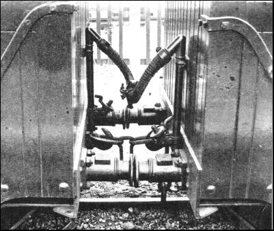 During the year following the opening the seven engines ran, without any serious breakdown, 106,121 passenger-train-miles on a consumption of about 11-1/2 lb. of Welsh coal a mile, including that used for lighting-up and shunting purposes. Over a quarter of a million passengers were carried. Fuel costs proved therefore a negligible quantity in miniature railway work. An expenditure of 2-1/4d. a mile for coal is not a serious item for a locomotive that can haul a fifteen-coach train, seating 120 passengers, at twenty-five to thirty miles an hour. For winter services the Romney line ordered a series of closed-in bogie coaches, measuring over 20 ft. in length. Their construction was similar to that of ordinary main line carriages, with compartments and side doors, but owing to the exigencies of the gauge and the presence of the two bogies at the ends, it was impossible to carry more than twelve passengers per coach for a tare weight of 2 tons 10 cwt. The average train is composed of two coaches only, and with a luggage truck is quite within the pulling powers of the locomotives. But owing to their weight the enclosed carriages are not used on the fine days of the holiday season when, very often, there is a crowd of 300 passengers waiting for trains. Then the light four-wheelers, or the equivalent articulated carriages, are used. These coaches are ten feet in length and carry eight adults or twelve children. They weigh only 17 cwt. each. As the Romney, Hythe and Dymchurch Railway came under the jurisdiction of the Ministry of Transport, the signals and the brake system had to conform to the statutory regulations governing the construction, equipment and operation of railways. It was decided, therefore, to convert the simple vacuum brakes as used on the Eskdale line to the fully automatic scheme employed on main line railways. This was successfully accomplished, and specially small ejector apparatus and power cylinders were devised. With automatic brakes, which work instantaneously if there is a breakaway in the train, a tight coupling between the carriages is essential. The use of screw couplings as on full-size railways was not a satisfactory proposition, and a special three-link coupling was experimented with. The centre link of the chain is a "T" shape and allows for either a slack or a tight coupling. When the line was completed the new three-cylinder locomotives "Typhoon" and "Hurricane" were received from the builders. Although, in common with the other "Pacifics," they were modelled on the lines of the L.N.E.R. "Flying Scotsman" locomotives, the later miniatures were provided with three high-pressure cylinders as in the prototype. As a result, therefore, they were nearly fifty per cent more powerful than the two-cylinder engines, and "Typhoon" proved this by working a train carrying the record number of 327 passengers from Dymchurch to Hythe. The dimensions of these "Pacifics" are as follows : The six-coupled driving wheels are 25-1/2 in. diameter on the treads, the bogie and tender wheels 12 in. diameter. The cylinders are 5-1/4 in. diameter by 8-1/2 in. stroke, the same as those of the two-cylinder "Pacifics" and mixed traffic engines. Walschaerts valve gear is used for the outside cylinders, and the Greenly-Joy gear for the inside cylinders. The total length is 25 ft. 1-1/2 in. over the buffers The standard wide-firebox boiler is used, and the bogie tender carries the driver, 1-1/2 cwt. of coal, and 190 gallons of water. To feed the boiler two steam "injectors" are used. The average time allowed for a stopping train from Romney to Hythe is thirty minutes, an average of 17-1/4 miles an hour. Ignoring stops—about seven minutes in all—the running speed is 22-1/2 miles an hour. To accomplish this it is often necessary to attain a speed of 32 miles an hour during the journey. At the trials at Eskdale 35 miles an hour was accomplished, and it is estimated that on a good stretch of level permanent way 39 miles an hour would be the maximum. This would be approximate to over 100 miles an hour in the prototype.