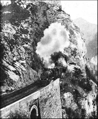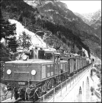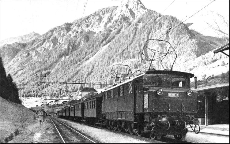 As the German State Railways and the Swiss Federal Railways had adopted on their electrified lines single-phase alternating current of 16-2/3 cycles, 15,000 volts at the contact line, the Austrian Federal Railways decided to use the same system. This enables Austrian electric locomotives to work into the common frontier stations of German and Swiss railways. It was only at the Italian frontier station, Brennero, that difficulties were encountered, by reason of the difference in the current systems, which was unfortunate in so far as it affected facilities for international traffic. To overcome this difficulty, the Austrian Railways constructed, about a mile from Brennero, a new station, Brennersee (or Brenner), up to which point trains are worked electrically, while from that station to Brennero steam haulage is used. Four new power stations were built to supply the necessary energy for the electrified sections. These were at Spüllersee, near Bludenz ; Ruetz, south of Innsbruck ; Stubach, south of Kitzbühel; and Mallnitz, west of the Tauern line. Arrangements were also made with the privately-owned Achensee power station, between Innsbruck and Kitzbühel, to supply current for the lines west of Salzburg, and with the Steeg power station for a supply to the Attnang-Puchheim section. The power stations are connected by transmission lines arranged for 55 kv, and the system is so laid out as to enable parallel working of all stations, as well as division into individual groups, to be possible. In the sub-stations the 55 kv current is stepped down to 15 kv. Four of the older sub-stations on the Arlberg line are in covered buildings, but others are constructed as semi-open-air stations, the 55 kv equipment being situated in the open, with the 15 kv installation, as well as the control-room, under cover. Three transformers are installed in the sub-stations, these being arranged to supply the necessary lower voltages for continuous output. Adequate testing equipment is installed in the sub-stations for the speedy remedying of service interruptions on the trolley wire. The mean range of a distributing station is twenty-nine miles, and it is possible, if one station is shut down or out Of action, to feed the section from the neighbouring stations without any serious fall of voltage. Among the many notable examples of Austrian railway engineering skill must be numbered those which were carried out before the Great War in constructing the second railway connexion with Trieste—the Tauern Railway. The chief obstacle in building the line was the surmounting of the massive mountain range, the High Tauern, which was overcome by the driving of a tunnel 5 miles 551 yards in length before the construction of the line was undertaken. Altogether it was necessary to construct seventeen tunnels with an aggregate length of 9 miles 196 yards, two of which, the Tauern and Dossen tunnels, were equipped with the Saccardo system of ventilation. There are also on the Tauern Railway no fewer than 260 culverts, while viaducts number thirty-four. The iron bridges on this particular line have a total length of 952 yards. The total length of the Tauern Railway is fifty miles. On the north side of the Tauern range it rises 2,083 ft., and On the south side 2,251 ft. The highest point of the line is reached in the Tauern Tunnel (4,022 ft.), and the steepest gradient is 1 in 37. The railway is a single line, except the section between Böckstein and Mallnitz, which includes the Tauern Tunnel. A journey over the Tauern Railway discloses scenes of great beauty. In climbing the High Tauern the whole of the Gasteiner Valley, with its famous health resorts, is seen below. Badgastein, 3,550 ft. above sea-level, with its great waterfall tumbling through the centre of the town, and its cluster of hotels on the sides of the hills, is the gem of the district. It contains some of the most highly radio-active springs in the world, which gush from the ground at a temperature of 117° F. and provide an ample supply of hot-water mineral baths to the whole town. Proceeding, the passenger sees, far below, villages and farms dotted here and there along the turbulent River Ache, but they are so distant as to seem almost Lilliputian. Winter sports on the high ground of this district attract many thousands of visitors each year.