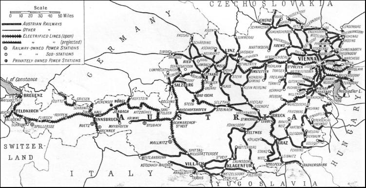 This was the first narrow-gauge steam-operated railway in any of the Germanic States. In 1857 the undertaking passed to the Kaiserin Elizabeth Railway Company, which operated the Vienna—Salzburg line, and in 1869 that company rebuilt the railway to standard gauge, converted it to locomotive working and made several improvements. One of the results of the disintegration of the old Austro-Hungarian empire was the loss by Austria of her chief sources of coal, only about one-half of the coal-fields of the former empire remaining within her borders. It therefore became necessary to import some sixty-five per cent of the annual coal requirements (about 9,000,000 tons), and this reacted unsatisfactorily upon an already unfavourable trade balance. To relieve the position to some extent, one of the earliest post-war developments was the building of a number of hydro-electric power stations, because Austria is particularly well furnished with water power. The extended use of electricity will cause this power to be exploited in the near future to the full. Before the war of 1914-18 no existing steam-worked railway had been electrified, although there were a few lines which had been worked from the beginning by electric traction. Among these the Mittenwald Railway, forty miles in length, was the only standard gauge electric line of main-line character. This line, which connects Innsbruck with the Bavarian frontier, was opened in May, 1913. It was worked with single-phase alternating current of 16-2/3 cycles and a voltage of 15,000. After the grouping of the Austrian Federal Railways in 1923 as a commercial undertaking, the electrification of four important lines was authorized. Their completion in May, 1935, was a crowning achievement of the Austrian Federal Railways. They are : 1. Innsbruck-Landeck-Bludenz-Feldkirch-Buchs, with the branch line from Feldkirch to Bregenz. 2. Salzburg-Innsbruck, with the branch lines from Worgl to Kufstein (German frontier) and from Innsbruck to Brenner (Italian frontier). 3. Stainach-Irdning — Attnang-Puchheim (Salzkammergut line). 4. Schwarzach-St. Veit—Spittal-Millstättersee (Tauern line). A beginning with the work of electrification was made with the railways of Tirol which, by reason of the steep gradients and long tunnels in the Arlberg section, were particularly suitable for electric working. All these lines were electrified between 1923 and 1926. The electrifiction was followed by increased train speeds on the important Arlberg route from Western Europe. In consequence, the doubling of the track over this section, and the artificial ventilation of the Arlberg Tunnel, which had become necessary owing to excessive soot and smoke from steam working, were rendered unnecessary. There are now 571 route miles of railway electrified, mostly main lines, in addition to certain short lengths originally constructed as electric railways before the war. Of these the metre-gauge Modling-Hinterbruhl line has been in existence since 1883—the year of the opening of the Brighton Electric Railway. In 1933 a new scheme was drawn up for the conversion of other steam-operated lines to electric traction. These included, among others, the lines between Vienna and Salzburg, and between Vienna and Graz. It has been decided to proceed with the electrification of the 196 miles main line from Vienna (West) to Salzburg, and to have the conversion completed at a cost of 180,000,000 Austrian schillings (nearly £5,250,000 at par.)