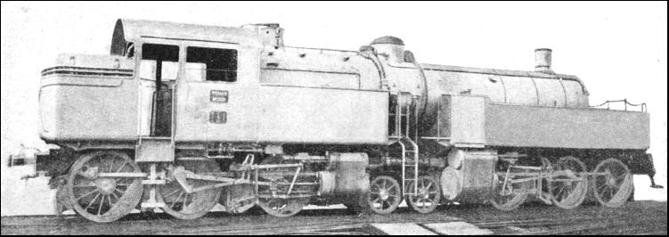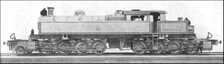 The "Erie" triplexes were designed for banking freight trains up the 1 in 67 Susquehanna incline in Pennsylvania. Each takes the place of three ordinary locomotives previously used as pushers. In trials made over a more level stretch of line, an "Erie" triplex drew a freight train of 250 loaded wagons, their total weight, excluding the locomotive, amounting to no less than 16,025 tons. Pusher engines were used at starting, to avoid excessive stress on the draw-gear. The triplex eventually attained a speed of 13-1/2 m.p.h. The train was over a mile and an eighth in length, and is believed to have been the longest and heaviest train ever hauled by one locomotive at any time in the history of railways. Similar triplex "Mallets" were built for the heavy coal traffic running over the Virginian Railroad. The provision of a trailing four-wheeled bogie, however, makes these of the 2-8-0 + 0-8-0 + 0-8-4 type. All the triplexes have six outside cylinders arranged in pairs, and are designed for compound working, though alteration to simple-expansion working can be made at will. This obtains with many compounds. The centre pair of cylinders in the triplex takes the high-pressure steam, while the outer pairs take the low-pressure, the exhausted steam from the rear pair passing up through a feed-water-heater in the tender to an auxiliary chimney at the rear. Certain giant 2-10-0 + 0-10-2 tender "Mallets," used on the Virginian Railroad in company with the triplexes, were built in 1918. These four-cylinder compounds, when starting from rest under simple expansion, exert the amazing tractive force of 176,000 lb. They are among the most powerful steam locomotives in the world. Although less complicated than the triplexes, they have the disadvantage, from the standpoint of track maintenance, of a great weight of 27 tons 11 cwt. carried on each driving axle. The heaviest train ever hauled by one of these locomotives was a coal train of 15,400 tons, a mile and an eighth long. After some rear-end assistance at starting and over preliminary gradients, the "Mallet" hauled the train unassisted 125 miles from Victoria to Sewall's Point, Virginia. The "du Bousquet" type of articulated tank locomotive, first used on the Northern Railway of France in 1905, somewhat resembles the "Mallet." In the "du Bousquet" design there are two driven trucks, supporting a rigid frame on which the boiler, cab, and accessories are mounted. The front bogie can move in any direction with relation to the boiler, while the rear bogie is free to turn only about a horizontal axis. The water is carried in four long side-tanks, while the coal occupies an ordinary bunker. In contrast to the "Mallet," which normally has each pair of cylinders placed to the fore of each wheel group, the four cylinders of the "du Bousquet" are bunched together opposite one another at the centre of the locomotive. This has the desirable effect of reducing the length of flexible steam piping necessary to connect high-pressure and low-pressure cylinders—"du Bousquets" are all of the compound type. These articulated tanks are not popular at the present day, partly because of the high power nowadays successfully developed in engines with a wheelbase not too long to be rigid. Some of the original "du Bousquet" designs built between 1905-11, however, are still giving useful service. They are all of the 0-6-2 + 2-6-0 type, and are closely similar. They were introduced on the Nord, Est, and Grande Ceinture Railways of France, and on the Pekin-Hankow Railway of China, these being of standard gauge. Others were ordered for the 5 ft. 6 in. gauge Andalusian Railways in the south of Spain. The primary intention of M. du Bousquet was to provide an engine capable of dealing with the heavy coal trains travelling to the east of France from the collieries of the north. The steepest banks met are graded at 1 in 83-1/2. Forty-eight of the special tanks were built for this work at the Northern Company's own shops, and they have shown their ability to haul 950-ton coal trains at 37 m.p.h.—thus showing the superior speed of the "du Bousquet" as compared with the semi-articulated "Mallet." "Mallets" and "du Bousquets" are not found in Britain, but the "Fairlie" type, already alluded to, has occasionally been employed there. The "Fairlie" articulated engine has been in use since 1865, and a number of variations of the original pattern are now found. There are three main "Fairlie" types : single-boilered engine, with one driven and one undriven bogie, or, rarely, two driven bogies ; dual-boilered engine, with two fireboxes and two driven bogies ; double-boilered engine, with one firebox and two driven bogies. In all examples the main frames are rigid from end to end, and the bogie trucks are usually six- or four-coupled, with no idle wheels, except, of course, in the first instance.
