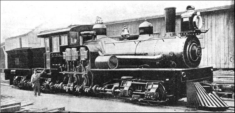 All "Fairlies" are tank engines. The single-boilered examples, with drive supplied only to one bogie, do not come strictly within the definition of an articulated engine, as the driven axles are rigid with respect to one another. Not a great many single-boilered "Fairlies" have been built. The second "Fairlie" type carries two boilers, placed back to back, with a separate firebox for each. Fire-holes are arranged at either end of the double cab, the coal being fed from bunkers carried alongside the boilers. The third "Fairlie" type, with double boiler, is very similar, except that the two boilers feed from a common firebox running lengthwise across the low-slung cab. The fireman works on one side of the firebox, while the driver works on the other side. In these double-end "Fairlies" the central firebox, or fireboxes, can be made of great depth and width, as there are no restricting wheels underneath. This suggests the "Garratt," as do the cylinders of the "Fairlie." They are located at the outer extremities of the trucks, usually for simple expansion. The double-end "Fairlie" provides a powerful unit on mountainous railways where curves are so sharp as to hamper the working of the more lengthy "Garratt" type. Express passenger "Fairlies" are rarely designed, although high speeds are claimed to have been attained with such engines in Mexico. "Fairlies" are chiefly used on narrow-gauge systems, although a few standard gauge examples have been used in Britain in the past. The four British main-line railways use none at present, but two are at work on the Festiniog Railway in North Wales. The curves here are as sharp as the sweep of Oxford Circus, London. The well-known little engines are the single-boilered "Taliesin," formerly "Livingstone Thompson," and the double-boilered "Merddin Emrys," both of which were rebuilt recently. A third "Fairlie" engine, the "James Spooner," is lying derelict, after forty-two years of service. What is known as the "Modified Fairlie" type engine, was introduced by the North British Locomotive Co., Glasgow, to the South African Railways in 1924. This type is primarily derived from the single-boilered "Fairlie," but it might also be described as an advanced edition of the later-built "Union-Garratt." As with standard "Fairlies," the main frame of the "Modified Fairlie" is rigid from end to end, and not merely for two-thirds of its length as in the "Union-Garratt." The relative positions of boiler, tanks, and bunker, however, are as in the "Garratt," with two driven bogie trucks at either end. The South African "Modified Fairlies" are of the four-cylinder 2-6-2 + 2-6-2 type, 3 ft. 6 in. gauge, and scale 113 tons in running trim. Yet another famous type of articulated locomotive, used for the same kind of work as the "Fairlie," is the "Kitson-Meyer" type. A Frenchman, Jean-Jacques Meyer, and his son, Adolphe, took out a patent for a completely articulated tank engine in 1861. The original "Meyer" design was not an outstanding success. As so often happens, however, an improvement on the original patent became world-famous. The modified design, itself split up into several varieties, goes by the name of "Kitson-Meyer." It is not used in Great Britain, but is largely turned out by the British firm of Kitson & Co., Ltd., of Leeds. "Kitson-Meyer" engines are principally of the tank type, though pseudo-tenders or even tenders are sometimes fitted. As with the "du Bousquet," the boiler and other superstructure is carried on a rigid frame, supported by two driven bogies. The "Kitson-Meyer" firebox, however, is superior to that of the "du Bousquet," since a space between the wheel-trucks allows unrestricted width and depth, as in the "Fairlie" and the "Garratt." The low-pitched firebox and boiler also allow a low loading gauge to be passed. The cylinders are placed at the rear of either truck, or else at the ends of the locomotive, as in the "Garratt." The rear cylinders arc exhausted through a rear chimney, as in the triplex "Mallet." The most common wheel formula for the "Kitson-Meyer" is 0-6-0 + 0-6-0, but engines with uneven arrangements, such as 2-6-0 + 0-6-4, have been used. The "Kitson-Meyer" is in operation in many countries, particularly in South America, where the lines crossing the Andes provide opportunities for the locomotive to show its advantages. The 3 ft. gauge Girardot Railway, in Colombia, has always made a speciality of the "Kitson-Meyer" type for its mountain line, which forms the principal link between Bogota, the capital, and the Pacific coast. The most modern engines on this line, of the 2-6-0 + 0-6-2 type, have, for tank engines on so small a gauge, the exceptional tractive effort of 40,000 lb. at 85 per cent boiler pressure. Driving wheels are 3 ft. 1-1/2 in. in diameter, the total wheelbase is 44 ft. 3 in., and the loaded weight 94-1/2 tons. To relieve wear and tear on the brakes while descending the 1 in 25 grades, a special arrangement enables the driver to exert a steam back-pressure of 145 lb. per sq. in. in the cylinders.