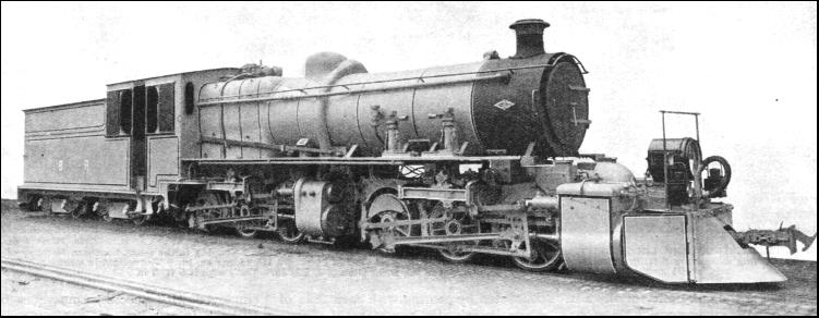 The "Mallet" differs from the "Garratt" in that it does not always have a corresponding wheel formula for both sets of wheels. Such unusual arrangements as 4-4-0 + 0-6-2 and 2-6-0 + 0-8-0 have thus been used at times. "Mallet" locomotives are mostly tender engines, though some tank engines have been built for the smaller railways. In the matter of speed, the "Mallet" does not compare favourably with the "Garratt," nor with other completely articulated types. Because of the rigid set of driving wheels at the rear, the enormous boiler and frames of the "Mallet" are directly subjected to any shocks due to inequalities in the road bed ; it is this feature which generally makes "Mallets" unsafe at speeds above 30 m.p.h. The abnormally long boiler is more of a disadvantage than an advantage. The short, large diameter boiler of the "Garratt," with very deep, square-bottomed firebox, gives superior evaporative capacity, and is easier for firing. There is, on the other hand, or there certainly was, an outstanding advantage in the "Mallet" semi-articulated design. The flexible steam pipes necessary with an articulated engine are susceptible to leakage when steam at high pressure is passed through them. It has therefore—until recently—been found difficult to obtain high tractive power within the limits in steam pressure allowed by the piping. Anatole Mallet here secured an advantage. Because of the rigidity of the rear pair of cylinders in his design, he was able to use high-pressure steam, which was afterwards allowed to pass at reduced pressure through flexible pipes to the forward and larger pair of cylinders attached to the bissel truck. In other words, Anatole Mallet made use of the dual-expansion or compound system—the system which he himself first successfully applied to a railway locomotive in France in 1877. During the past decade such strides have been made in the design of ball-and-socket and sliding joints in steam pipes that high-pressure steam can now be passed without difficulty. In consequence of this perfection of flexible steam piping, the "Mallet" locomotive has lost a former advantage over the fully articulated type. It has, at the same time, shared with other articulated engines the benefits of this improvement in design and "Mallets" carrying high-pressure steam in all cylinders are now becoming common. The successful new piping will also prevent such tedious experiments as were made, for example, by Mr. Johnstone, the American engineer, in 1885. To avoid the use of flexible steam pipes, Mr. Johnstone produced a modified type of double-end "Fairlie" engine, in which the cylinders were securely attached to the main frames, while the wheel trucks rotated as in an ordinary articulated engine. The extraordinarily complicated arrangement of valve-gear and connecting rods necessary to make the engine function can well be imagined. The "Mallet" semi-articulated type has been found valuable on railways varying from 5 ft. 6 in. to 1 ft. 1-1/2 in. in gauge. The United States have turned out by far the greatest number of "Mallets" and the largest examples of this type of locomotive. American engineers have even made experiments with "Mallets" having separable and articulated boilers, the latter being ingeniously arranged on the concertina principle for a space of a few feet in the middle. The largest steam locomotives in the world, at the time of writing, are of the "Mallet" type, and are used for hauling freight trains over the 1 in 91 grades between Mandan (North Dakota) and Glendive (Montana), 216 miles, on the Northern Pacific Railway. They have the 2-8-0 + 0-8-4 wheel arrangement, and weigh, with tender, 498-1/4 tons in running order. There are four high-pressure cylinders, taking steam from a boiler pressed at 250 lb. per sq. in. Particularly interesting are the "Mallets" of the "triplex" type, first used on the Erie Railroad in 1914. Three engines were set to work during the early years of the war of 1914-18, one of them being named "Matt H. Shay," after a famous "Erie" engine driver. In these engines there are three sets of driving wheels instead of two, as in the standard "Mallet." The wheel formula is 2-8-0 + 0-8-0 + 0-8-2, a pseudo-tender forming an integral part of the rear truck. The middle set of driving wheels is rigid, while the outer sets are of the customary bissel type. The weight in working order is 383 tons 13 cwt., the overall length 106 ft., and the estimated tractive force 160,000 lb.