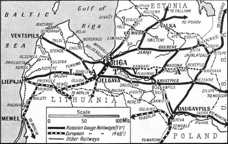 Another factor was the changed economic situation. Before the war Riga was an outlet for Russian produce, which was brought to the port by rail, but after the war this traffic practically ceased to exist, although it revived later. Further, the railways had been built as part of the Russian system to serve the needs of that country, and adjustments were necessary to make them serve the needs of Latvia. Its position makes Riga the natural capital, and it is not only a great port but also the focal point of the railway system. Only a few new links were needed to form a good network of lines for the new country. In addition to Riga there are excellent harbours at Liepaja and at Ventspils (formerly Windau), both of which are west of Riga and are on the Baltic. Riga lies a few miles from the mouth of the River Daugava, which flows from Russia and is used for floating rafts of logs which are cut up at sawmills at the port. Some of this timber comes from. Russia and Poland, but the bulk is from Latvia. As the country is flat and low-lying it does not offer many difficulties to the railway builder. The chief inland towns on the railway network are Daugavpils, Jelgava (formerly Mitau), Rezekne, Krustpils, Valka, Valmiera and Tukums. When the Germans invaded Latvia they altered the track to standard gauge, as they had done for military purposes in Lithuania and in Poland. Riga being the natural outlet for Russian trade, the Letts restored the Russian gauge on the principal lines leading to and from Russia. Some of the lines leading south from certain towns and connecting with Lithuania and Poland were, as explained later, left on the standard gauge.