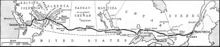 Beyond Revelstoke the express crosses the Gold Range through Eagle Pass, where, at Craigellachie, an obelisk commemorates the completion of the Canadian Pacific Railway and the driving of the last spike of the great line. The spike was driven in at Craigellachie by the late Sir Donald Smith (Lord Strathcona) on November 7, 1885, and the first transcontinental train ran in 1886. Vancouver is drawing steadily nearer, but there are still the Thompson River Canyons to traverse. They, in turn, lead on to the celebrated Fraser Canyon—the only practicable passage for the railway. As the train passes along the constricted terraces the passengers—comfortably reading the current newspapers—may not appreciate how great the difficulties of blasting away along the slopes of these canyons must have been. At Lytton the canyon widens, to admit the Fraser, the chief river of British Columbia. This river comes pouring down from the north between two great lines of mountain peaks, and its turbid flood soon engulfs the bright green waters of the Thompson. This section of the railway again exemplifies the skill and courage of the builders. The line follows the canyon at a considerable height above the river bank, while the track itself has been hewn through solid rock. At Hell's Gate, attention is arrested by a fine view of a spectacular cataract formed by the sudden compression of the river between two jutting promontories, whence it escapes through a bottle-necked outlet. Beyond Yale, occupying a cleft above the river, in a deep recess in the mountains. Here the canyon in which the train has been travelling for so long begins to fall away, and now come the valleys through which the express swiftly sweeps on towards Vancouver. The time is nearly up, the destination at hand, and although the passengers cannot all visualize the difficulties of constructing the route which the express takes, they feel proud of the engineering triumph which has rapidly transported them over thousands of miles. Now come the outlying districts of Vancouver. There is a considerable bustle in consequence. People begin packing their light luggage. Though they are still on the train, their journey is over. It has been a dreamlike experience, an unforgettable episode—crossing the entire stretch of Canada in 89-1/4 hours ! Here is a view of Vancouver itself. The city ranks as one of the principal ports on the western seaboard. Built on Burrard Inlet, the fully-sheltered harbour has a favourable place on the world's highway of commerce and is developing into an important shipping centre. The great "Trans-Canada Limited" express is slackening speed, and gliding into the station. A few days later it will return to Montreal The carrying of passengers in complete comfort, even for 3,000 miles, by no means gives the full significance of the railway system over which the "Trans-Canada" passes The journey from Montreal to Vancouver, perhaps the finest panoramic spectacle the world has to offer, also makes a thoughtful passenger realize the supreme importance of the railway to the industrial and commercial existence of Canada. Over half a century the railway has expanded by 20,000 miles of line. The single track of early pioneer years has been converted into a double track from ocean to ocean ; branch lines and connexions have been extended north, south, east and west. Where the rails have been driven, settlements, towns, and cities have grown up. Many of the towns the express passed on the route were scarcely in existence fifty years ago.