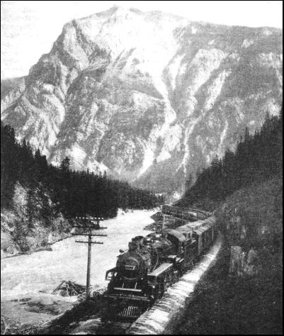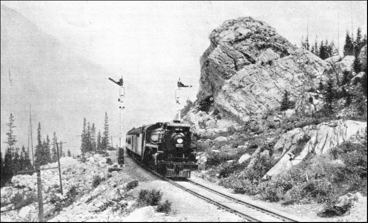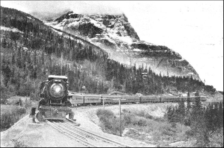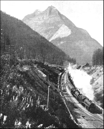 From Calgary to the "Gap" the railway closely follows Bow River. Winding and climbing, the line now enters this natural approach. The climb, up is long and slow. As the rails twist tortuously in and out of crags and terraces, the engine labours to the summit at Stephen, at which point the line lies at 5,329 ft. above sea level, having climbed 1,901 ft. in 123 miles. While the railway winds along the course of Bow River, between Banff and Lake Louise, dense forests, over which mountains tower on either side, can be seen from the carriage window. Far to the south the passenger has a view of the dream-like snow-clad peaks that enclose Simpson's Pass, and he cannot help wondering what it would be like to ascend these magnificent heights. The train goes on towards the "Great Divide," whence the waters from the glaciers separate to course down eitlier side of the mountain before heading for the Arctic or the Pacific. It is a vast marsh and the summit was conquered without tunnelling or erecting protective snowsheds. The descent, however, falls away so suddenly that to keep the gradient within limits tunnelling was employed to a large extent. As originally planned, when time and money were scarce, a temporary line was constructed involving a steep grade of 1 in 23, for 4 miles. But when competition enforced drastic revision the route on "Big Hill," as the climb was nicknamed, was abandoned. Instead, by an ingenious relocation of the line, including the boring of two spiral tunnels on opposite sides of the valley, the gradient has been flattened to an average of 1 in 50, at the cost of 4-1/2 miles increase in distance.