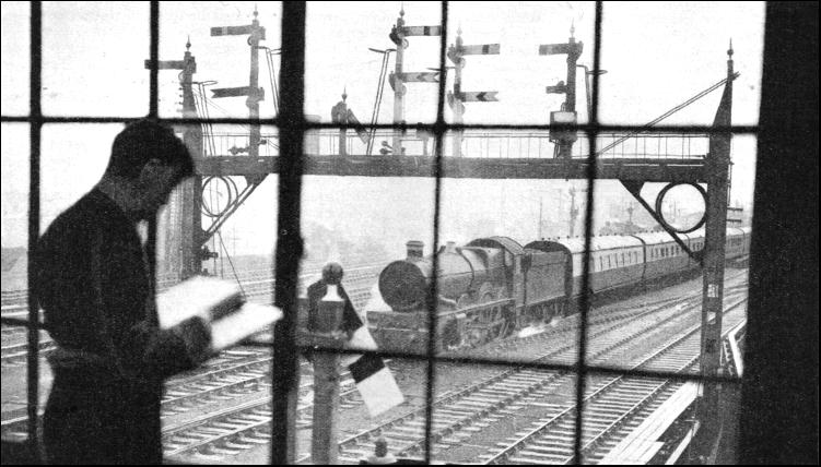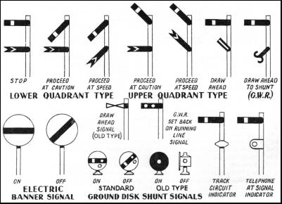 Below is a set of diagrams explaining the meanings of signals and ground disks, and certain of their variations which are most widely used. At the top left hand side appear home and distant signal-arms on one post. The second and third of these diagrams show the older "lower quadrant" type of semaphore arm, in which the arm drops when pulled to the "clear" position. Except on the Great Western Railway, this type is now being replaced by the "upper quadrant" type, in which the arm rises when pulled off. The substitution is chiefly for purposes of economy. Provision must be made for the signal to return automatically to "danger" in the event of any breakage of its operating mechanism. The lower quadrant arm had therefore to be provided with a heavy spectacle casting, holding the red or yellow and green glasses that move in front of the lamp, to provide a "balance" that would return the arm to danger should the rod from the base of the post break or become disconnected. But such a breakage, with an upper quadrant arm, would simply result in the arm falling to danger by its own weight, and a much lighter and more economical spectacle casting thus serves the purpose. With both home and distant signals "on," "danger" is indicated, and the train must stop. The home signal "off" and the distant signal "on" indicate that only one block section ahead is clear, and instructs a driver to "proceed with caution." Both home and distant signals pulled off show that two or more sections ahead are clear, and permit the driver to "proceed at full speed." The upper, or home signal arms are square at the outer ends, and are painted red with white stripe on the side facing the driver ; at night they display a red light for "danger," and a green light for "clear." The lower or "distant" signal arms are painted yellow, with a black stripe, and display at night an orange light when "on," and a green light when "off." Provision is made by locking, by means of a "slot" on the post itself, to ensure that the distant arm cannot be pulled off unless the home arm is also off, and to return the distant arm to danger when the home arm returns to danger, even though the balance weight of the former is still pulled off. The corresponding indications with colour-light electric signals are red for danger, yellow for one section ahead clear ("caution"), and green for two or more sections ahead clear ("full speed"), except where, on very densely-occupied routes, the double yellow indication is in use, when two yellow lights show two sections ahead clear, and green shows three or more sections ahead clear. Reverting to the third set of diagrams, at the right-hand end there are shown types of miniature or subsidiary signals which permit a driver to draw past a home signal at danger, though not to leave the section. The short arm with a horizontal white stripe is a "draw-ahead" signal, often used, for example, at stations to enable a train to draw in to the rear end of a platform when the front end is already occupied with another train. The short arm marked "S" is used on the Great Western Railway and indicates "Shunt" ; it indicates to a driver that he is to shunt back into a siding. In the centre of the diagrams the arm made in the shape of a cross is another variety of "draw ahead" signal ; and the arm with two holes in is in use on the Great Western Railway to permit a train to "set back"—that is, travel for a short distance in the wrong direction to the flow of traffic—along a running line. Along the bottom of this diagram, at the left-hand end, there first appears a "banner" signal, in both the "on" and "off" positions. This is electrically worked, and its use is normally confined to busy routes only ; customarily it "repeats," automatically, the position of the next stop signal ahead, which by reason of curves or other obstructions cannot be seen until the train is closely approaching it. In the centre of the bottom row of diagrams are seen "ground disks," which are fixed at ground level, and used to control shunting movements only. The low location is so that there shall be as little confusion as possible with the "running signals" controlling the through running. The new standard type of ground disk is on the left, in both the "on" position, when it displays a small white light, and in the "off," when it shows green. The disk itself is painted white, with a red bar across. The older type, on the right, is a disk that rotates, showing a red face with a small white light when "on," and a green side, with a green light, when "off." The last two diagrams, in the lower right-hand corner, are connected with the all-important "track circuit," whereby the whole of the track in the vicinity of a signal-box is electrified, and any train, engine, or vehicle standing in the area so controlled, by providing a short circuit between the rails, advertises its presence on an indicator in the box, and imposes a lock on the signal lever controlling admission to the section on which it is standing. Now if a train is brought to a stand for any appreciable time at a home or starting signal, Rule 55 of the Rules and Regulations requires the fireman to proceed to the signal box so that the presence of the train may not be overlooked. This is not necessary, however, if track circuit is in use, and if the line is track-circuited, a white diamond is fixed to the signal-post, as shown, below the signal-arm concerned. More infrequently, and especially if several tracks have to be crossed to reach the box, a telephone is provided at the signal-post so that the fireman may get into communication with the signalman in this way ; and the existence of the telephone is then announced to the driver by the white loop affixed to the post in the same position as the white diamond. On the former Great Northern Railway, now part of the L.N.E.R., the "somersault" type of signal arm was used. This was pivoted in the centre instead of at the end. When the "s