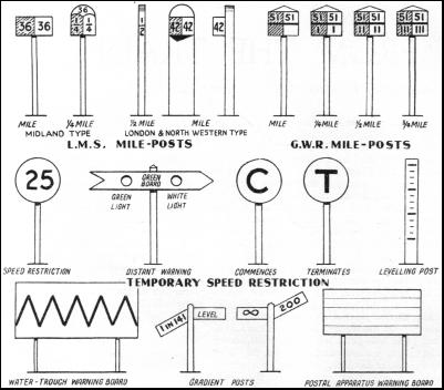 The mile-posts of the Midland Division, which are the largest and most easily seen of any in Great Britain, are all on the up side of the line, and form one uninterrupted sequence from zero at St. Pancras to Carlisle. On the Great Northern Section of the L.N.E.R., the down side of the line is favoured, and the posts run through from zero at King's Cross to York. From here, over the North Eastern Area, there is one series from York to Newcastle, and another from Newcastle to Berwick, all on the down side. But a change is then made to the posts of the Scottish Area, which are measured from zero at Edinburgh (Waverley), and are all on the left side of the line leading from Waverley, which is, of course, the present up side between Berwick and Edinburgh. The Great Western Railway favours the up side of the line, and the Western Section of the Southern Railway (the late London and South Western Railway) the down side. All the Great Western series follows the original routes; this leads to some curious mile-post readings on a journey, say, from Paddington to Penzance From London to Westbury the posts are in direct sequence, via Reading and Savernake. From Westbury to Castle Cary the posts are marked in accordance with the original Weymouth route, from Paddington via Swindon and Trowbridge. Then comes a resumption of the direct London distances, from Castle Cary to Cogload, where the series from London via Bath and Bristol is joined ; this continues for the remainder of the journey. The speed restriction signs, illustrated on this page, require some explanation. The one marked "25" indicates a permanent speed restriction to twenty miles an hour. Next come the movable signs used in connexion with track relaying and other permanent way work. First is the green board, fixed, similarly to a distant signal, half a mile away from the site of the speed restriction, and displaying white and green lights at night, side by side. Then comes the "C," or "Commences" sign, where the speed restriction begins, followed by the "T," or "Terminates" sign, at the point where normal speed may be resumed. All these signs are illuminated at night, and frequently the figure to which speed must be reduced is now also displayed at the outer "caution" sign. The "levelling post" shown at the right hand side of the series of diagrams is generally found as one of a series erected at the line-side where subsidence trouble is being experienced, especially in colliery areas. These posts are installed at intervals with their graduated divisions exactly in line, so that it is readily possible to detect by eye if any one post in the series has subsided. At the bottom of the diagrams are seen, on the left, the type of warning board used on the Great Northern Section of the L.N.E.R. to indicate to drivers the beginning of water-troughs. Other main lines have a variety of similar trough indications, but some give no warning of this description. The corresponding plain board on the right-hand side is displayed immediately in advance of the ground apparatus for the exchange of mails to warn the postal officials on the mail trains to be in readiness if exchange is about to be made. Between these are seen two varieties of gradient posts, which indicate the changes of gradient. An upward tilt of the indicator shows, of course, the beginning or end of an up gradient, and a downward tilt a down gradient. On some lines the full "1 in 200," or whatever the gradient may be, is inscribed ; on others merely the significant figure "200." On certain routes, such as the Great Eastern Section of the L.N.E.R., the infinity sign is used instead of the word "level," where level track is indicated.