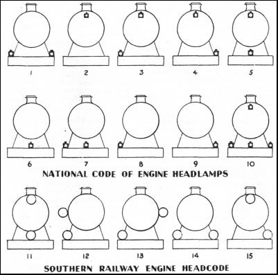 The second series of diagrams explains the arrangement of the headlamps carried on the front of locomotives on most of the railways in Great Britain. Readers will probably have noticed that lamps are mounted in this way by day as well as by night. The object is for these lamps to indicate to signalmen and others concerned with the working of the traffic the exact nature of each train. In the national headcode the positions used are four only. One is at the base of the engine chimney, either on the top of the smoke-box, or—now that the upper level of the boiler is often so high and the chimney so short—at the top of the smoke-box door. Two more are at either end of the buffer-beam, and the fourth position is in the centre of the buffer-beam. In the normal course the lamps used show white lights only, and on the L.N.E.R. the lamps themselves are painted white, so that they may be the more easily seen in the daytime. Of all the headlamp indications, probably the most familiar is the pair of white lights, one over either buffer, which indicates "Express Passenger Train." Then there is one single light at the base of the chimney, indicating "Ordinary Stopping Passenger Train." Other indications, for freight trains of various kinds, light engines, and empty coach trains, are explained on the diagrams. The only code requiring the use of all four lamp-irons at once is "Royal Special Train." On the Southern Railway, however, the complexity of routes is such that the lamps are used to indicate the route that each train is to follow, rather than the description of the train. Further, in the daytime, for ready recognition, the lamps are replaced by circular sheet metal disks, painted white. Some of the best-known main-line route indications on the Southern are shown in the diagrams, from which it will be seen that there are six lamp positions, instead of four only, on Southern locomotives. In addition to the four positions of the national headcode, there are lamp and disk positions on either side of the smoke-box, affording a notably wide variation in the indications. Continental express trains from Victoria to Dover carry their lamps in the "Express Passenger" position ; express trains from Waterloo to Salisbury and the West carry their lamps in a vertical line, one at the base of the chimney, and one in the centre of the buffer-beam. On the Great Eastern Section of the L.N.E.R. also, disks are used in the day-time, on the main lines and country branches in accordance with the national headcode, and in the London suburban area for route indicating purposes, as on the Southern. On these Great Eastern lines blue lights as well as white lights are employed, replaced in the day-time by blue disks with white rims. There are certain other routes in Great Britain over which disks are used for indicating purposes of one kind and another. In Scotland an ingenious type of route indicator is employed on the Caledonian and Glasgow and South Western Sections of the L.M.S. It consists of a frame with two movable arms, painted white, which can be altered in the manner of the hands of a clock. Most familiar of all its positions, probably, is with the two arms set horizontally, at "a quarter to three," which indicates the main line from Glasgow to Carlisle via Carstairs. The engine of the "Royal Scot," if working through from Glasgow to London, is often seen arriving at Euston with its Scottish indicator, at the base of the chimney, set in this position.
