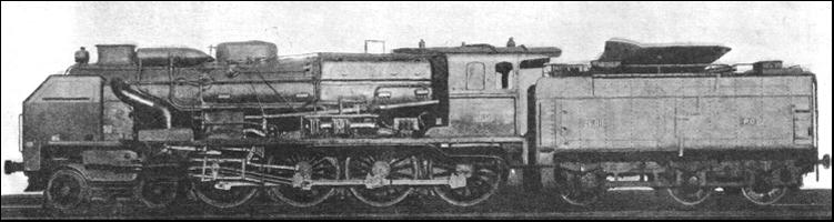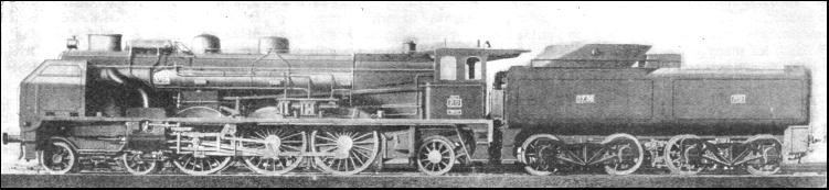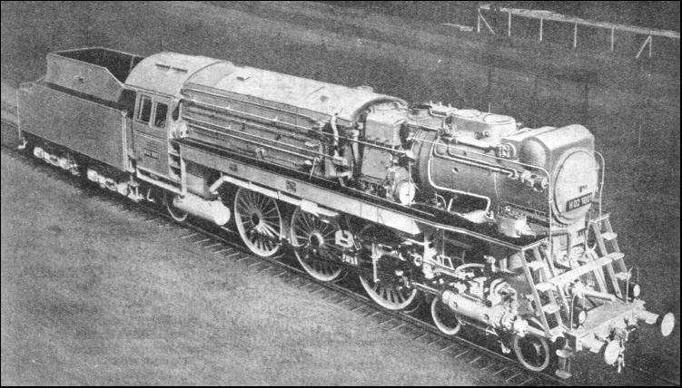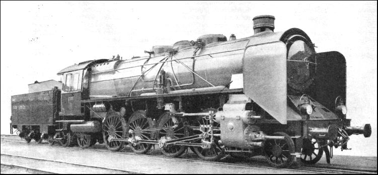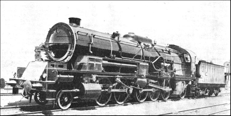 The Paris, Lyons and Mediterranean Railway has always been notable for its large and powerful engines. It was one of the first French companies, after the Paris-Orleans Railway, to introduce "Pacific" locomotives. Hundreds of P.L.M. "Pacifics" have been built since the first were brought out in 1909. By way of preliminary, a four-cylinder compound was tried against a four-cylinder simple, and a substantial victory was won for compound propulsion. Later, the engines were superheated, with a further increase in efficiency. In more recent years the methods of rebuilding which have proved so successful on the Paris-Orleans Railway have been followed on the P.L.M. with equally striking results. But the P.L.M. has some very heavily graded sections of line, in particular that between Dijon and the Swiss frontier at Vallorbe. There is also the southward ascent from Dijon on the main line to Paris, which for 9-1/4 miles of the distance to Blaisy-Bas, 16-1/2 miles away, is inclined at 1 in 125. Over this route a dense traffic is worked, particularly at night, express trains of great weight succeeding one another at intervals of roughly ten minutes. It is essential that the locomotives used shall be powerful and reliable, for one train losing time may delay a succession of others. For this reason the P.L.M. introduced a class of enormous "Mountain" (4-8-2) type express engines in 1925, each weighing 115 tons without, and 185 tons with tender. The diameter of the driving wheels was kept down to 5 ft. 11 in., to give the necessary power uphill, and in consequence the maximum speed of these engines has been generally restricted to 100 kilometres (62 miles) an hour, though this by no means represents the limit attainable. Externally they are notable both for their length and for the coned smoke-box door, projecting well in front of the chimney, the idea being to carry the exhaust high above the front of the cab. Experimentally one engine of this class has been built with the Schmidt super-pressure type of boiler, working at a pressure of 1,000 lb. per sq. in. With a view to developing higher speeds, another "Mountain" has been built with driving wheels 6 ft. 5 in. in diameter. Neither variation of the standard class has been multiplied.