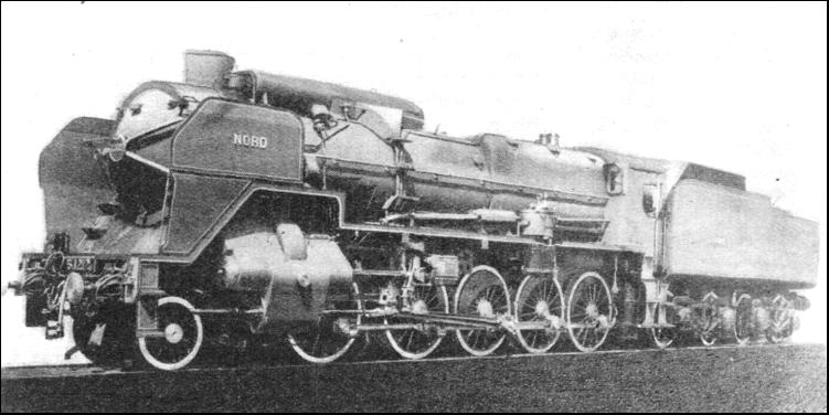 But it is not merely on the tests, when conditions as nearly as possible perfect may be expected, that these engines have done well. Details were published in a French transport paper recently of a run on the 8.40 a.m. express from Paris to Bordeaux, which is always in summer a very heavy train, and on this occasion was made up to seventeen cars weighing no less than 784 tons, hauled, without assistance, by rebuilt "Pacific" No. 3717 from St. Pierre-des-Corps onwards. In the earlier stages of the run this vast train was worked along level stretches of track at 67 miles an hour, and the climbing included such achievements as an average speed of 56 miles an hour, and a minimum of 52-1/2, up seven miles inclined at 1 in 225. Time was being kept, and slightly improved on, when there was an unexpected happening. When the regulator was opened to start this enormous load away from Angoulême, the strain proved too much for one of the couplings in the train, which broke. Unfortunately it was a large brake-van that was thus put out of action; two other vans had to be substituted, to give the same accommodation, and after all the luggage had been transferred. the express restarted at Angoulême, now 28 minutes late, and made up to 807 tons. The driver was heard by an observer on the footplate merely to remark laconically to his fireman, "We shall have to work," and work they and the engine certainly did, in most astounding fashion. Up the climb to Charmant Tunnel, varying in steepness chiefly between 1 in 250 and 1 in 192, the speed was maintained steadily at 53 to 54 miles an hour, and the summit point, 15.5 miles from Angoulême, was passed in just over 21 minutes, with the engine cutting off at 60 per cent in the high-pressure and 58 per cent in the low-pressure cylinders, and a superheat temperature of 700 degrees Fahrenheit. Speed ranged between 71 and 78 miles on the easier section between Charmant and Montmoreau, and the 50.6 miles from Angoulême to Coutras, scheduled to be covered in 57 minutes, were completed in 50 minutes from start to stop. In all, the locomotive regained 22 minutes between St. Pierre-des-Corps and Bordeaux, of which 15 minutes were recouped alone along the stretch south of Angoulême. As an instance of high-speed work with lighter loads, the present writer has the liveliest recollections of a journey from Bordeaux to Paris, on the northbound "Sud Express," which had started very late from the Spanish frontier. Signalled 49 minutes late from Lamothe, the last stop before Bordeaux (on the electrified Midi section), it arrived 45 minutes, and left for Paris 43 minutes late. With only three Pullman cars, and two large brake-vans, weighing 225 tons all found, this was not a big task from the haulage point of view, but the way in which time recovery was tackled without exceeding the French speed limit of 120 kilometres (74-1/2 miles) an hour was astonishing. From Bordeaux to Les Aubrais No. 3709, one of the rebuilt "Pacifics," recovered 36-1/4 minutes, and that on what was then one of the four fastest long-distance train schedules in the world, although some of the regained time was lost again by permanent way slowings. A total of 330 kilometres (205 miles) was covered at an average of 70 miles an hour. The running times for the 286.2 miles from Bordeaux to Les Aubrais totalled 264 minutes 54 seconds. and the net times, allowing for checks, but not for five service slacks through curves at stations, 257 minutes. Many other striking examples of modern Paris-Orleans locomotive work might be quoted did space permit. The success of these reconstructions suggested the desirability of rebuilding some further engines on similar lines to work over the heavy gradient's of the Paris-Orleans main line through Central France. A "Pacific" of another series. with smaller driving wheels, was therefore taken, and to give increased adhesion weight, the rear pair of carrying wheels under the firebox was removed, and a fourth pair of coupled wheels was substituted. The locomotive was thus converted to the 4-8-0 wheel arrangement, and the adhesion weight was increased from 51-1/4 to 73-3/4 tons. The same alterations were made as in the converted "Pacifics," including larger steam passages, double exhaust and chimney, Nicholson thermic syphon in the firebox, and cam-operated poppet-valves to the cylinders; but the additional pair of coupled wheels at the rear end necessitated a modification in the shape of the fire-grate, which now became long and narrow.