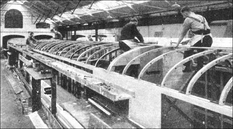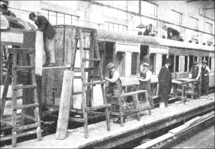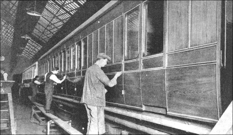 In these works the machining operations are so arranged that the timber flows in a continuous stream from one machine to another, and the rough wood is delivered as a finished component ready to assemble in the erecting shop. The whole process is facilitated by the provision of roller "run-ways" so arranged that timber is fed to the machines at the correct height. At no point in its passage through the shops is the work lifted by hand. The next process is the assembling of the component parts of the coach. At the Swindon carriage works of the Great Western Railway the procedure is first to construct the floor which will rest on the under-frame of the coach. Next follows the fixing of the side and end pillars and battens, after which the window lights and the rails are added. At this stage the coach somewhat resembles an early wooden ship, the floor representing the keel, and the upright portion the ribs that hold the outer planking. Inside compartments and corridor partitions are added next, and then the doors. Next, steel-plate panels are screwed on the outside of the body of the coach. Preparation of the roof follows. This is of steel plate screwed to roof "sticks" of oak that are bent to the required curvature. After seat frames have been fitted in the compartments, the body is placed on its undercarriage and run into the paint shop. Here it receives attention at the hands of the finishers, trimmers, and painters. The steel panelling on the outside of the coach is cleaned and prepared by workmen, who are followed by others who paint the metal surface. The lining of the paintwork and the affixing of crests and numerals is then undertaken; finally the whole of the exterior is given two coats of varnish. The undercarriage is painted with red lead before it enters the carriage body shop, and, after the addition of the coach-work, the outer parts of the frames and bogies are painted and japanned.