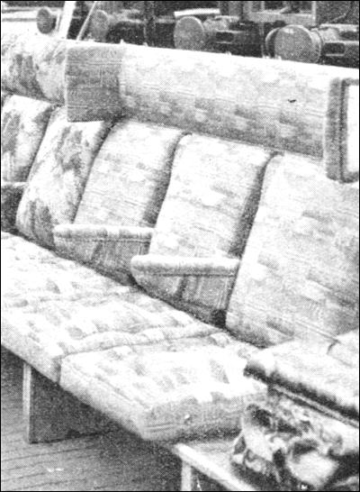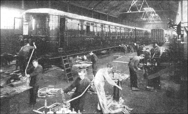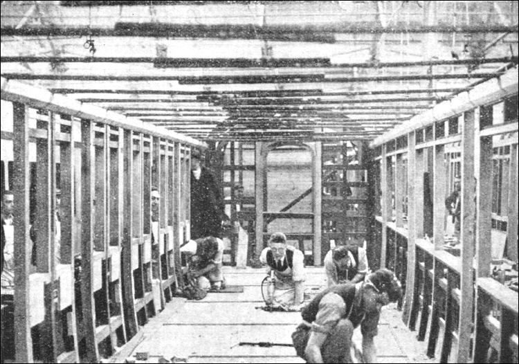 Screw-driving in a carriage works is facilitated by the use of a magazine-teed tool into which screws are fed through a funnel. The workman applies the screw to the hole, previously drilled in the woodwork, and the apparatus automatically drives it in. With the use of steel for coach building a new technique has been rendered necessary in construction. To take advantage of the strength and safety afforded by steel framework, and at the same time to reduce weight, welding is resorted to instead of the customary riveting. Welding is done by electricity or the oxy-gas blowpipe, and the process enables a lighter section of steel angle to be employed, as the joints are not weakened by the drilling of rivet holes. In addition, the rivets dispensed with represent a further saving in the total weight. In a modern steel coach the bogies are welded throughout, with the exception of the brake-work and axleguards, which require fairly frequent renewal. The floor is usually of steel sheeting welded directly to the coach under-frame, to which are also welded the steel sockets carrying the teak end and side pillars. The tops of the pillars fit into steel brackets welded to the "cantrails," the steel longitudinal members to which are welded the ends of the steel arch rails of the roof. The floor of a modern steel coach, particularly of a sleeping car, is carefully insulated to eliminate noise and vibration. The steel sheeting on the under-frame is covered with cork slabs cemented in place with a special composition material. Over the cork and composition is placed a layer of felt, and on this is laid linoleum, covered in both corridor and compartments by rugs.