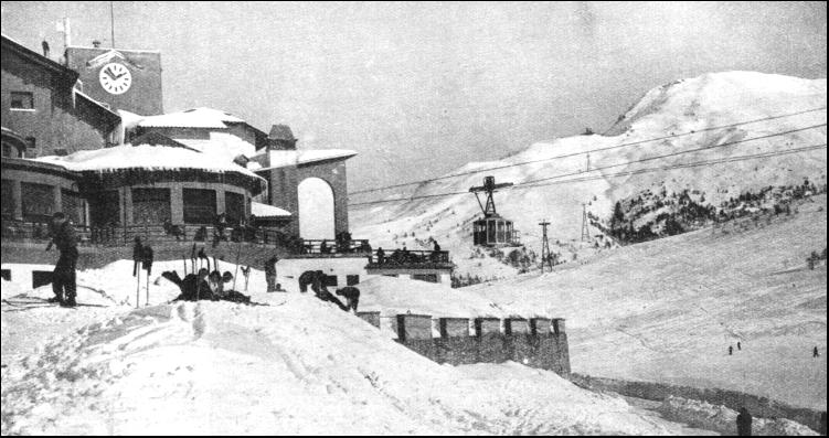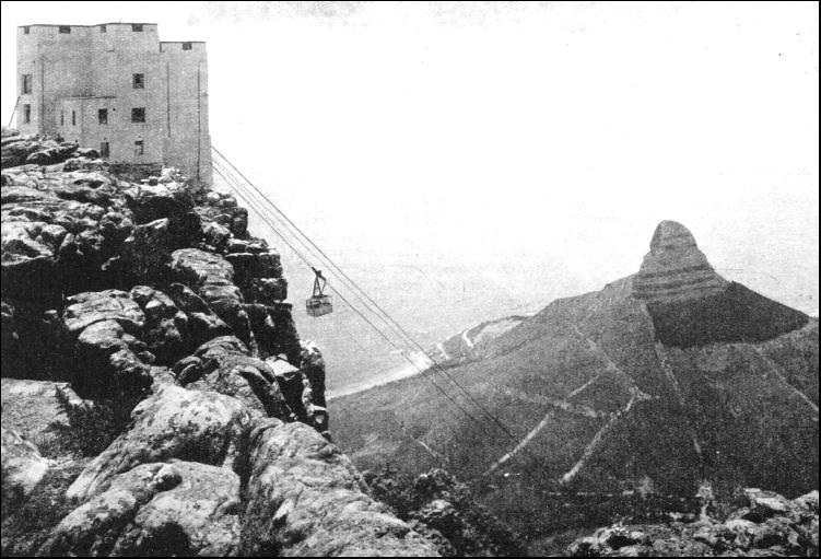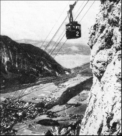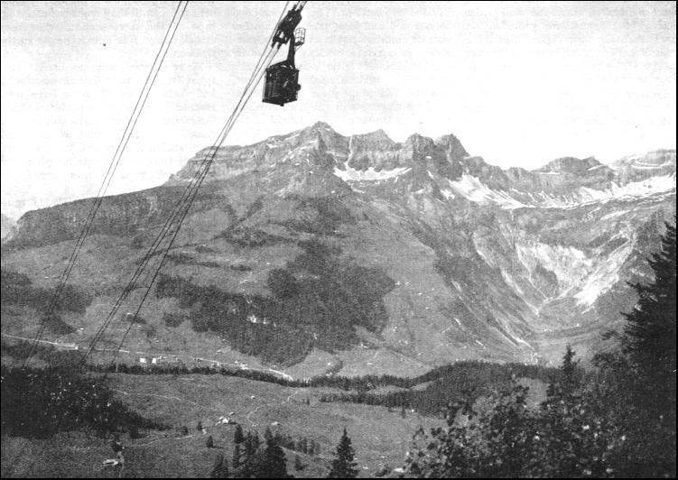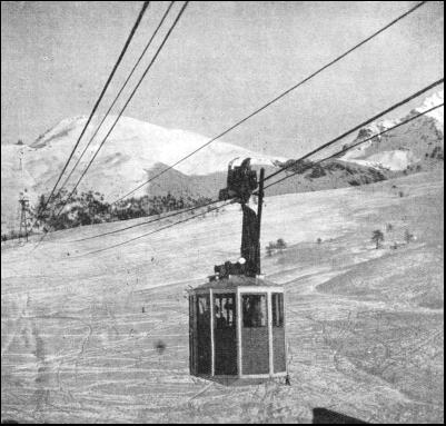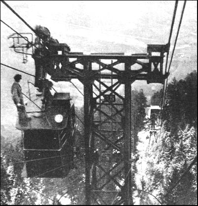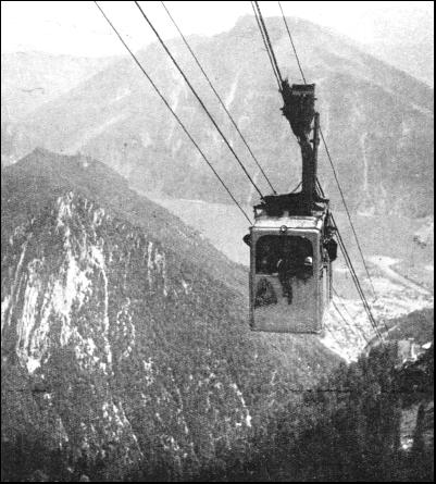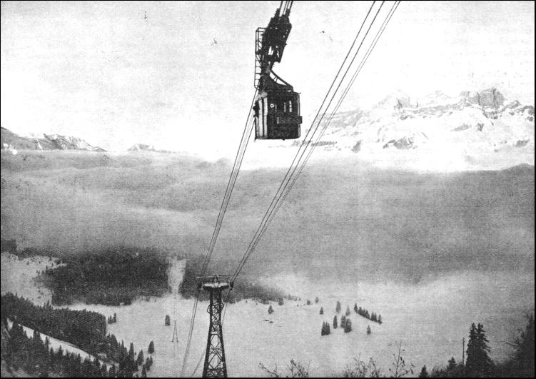 The braking system is designed to ensure perfect safety. If a hoisting rope should break there is a powerful clip which automatically grips the track, and so brings the car to a standstill. This emergency device is so powerful that during the trials, when one of the hoisting ropes was deliberately broken, the car slipped back only six inches before it came to a stop. Even if one of the track cables snapped, the brake would instantly come into operation, and after the car had been stopped it could be restarted and driven slowly into its station along the remaining cable, which is tested to withstand several times the weight of a car. This brake is not only automatic, but can also be applied by the driver, so that whatever should happen it is impossible for the car to slip out of control. At the same time the stations are fitted with automatic and hand-operated brakes to guard against every contingency. such as the failure of the power supply, the breakdown of the machinery or some mishap on the track. There is also an accumulator battery, capable of running the railway for several hours continuously should the main supply fail. It this also failed while cars were running on the track they could be wound in by hand, either with the passengers inside or after an emergency car had been sent down the track to take them off. Even these safety devices are not considered to be sufficient. In the most unlikely event of the failure of all these devices, passengers can still be taken from the car. As emergency apparatus, each car carries a collapsible bag with a rigid bottom. The bag can be lowered through a trap-door in the car-floor, a passenger standing erect within it. A braking gear controls the transit of passengers to the earth, so that the descent shall not be too rapid. The travelling speed of this cable-way is rigorously restricted by the authorities, and expedients have had to be introduced to keep the speed within prescribed limits. There is a speed regulator, set to the permitted maximum. The moment the car, either in ascending or descending, exceeds the speed, the automatic brake comes into action and checks the rate of travel. The authorities have also forbidden the operation of the railway during high winds. A wind-speed indicator is mounted on the roof of the upper station on the mountain. This indicator is connected to a bell signal. Directly the wind exceeds a certain speed, to which the apparatus is set, the bell warns the mechanic to suspend the service. In point of fact, however, there is no danger of high winds affecting the safety working, but the official regulations have to be observed. When passengers travel on this aerial railway they will notice a complete absence of vibration or swinging of the cars. The vehicles start without any perceptible jerk and glide steadily and smoothly up and down the side of the Kohlerer Mountain. When the cars approach a station the speed is automatically decreased and the transit ends as easily as it began. In addition to the telephone and electric lighting circuit between the stations for the transmission of the starting signals, a special telephone wire is provided for the convenience of the driver of the car. The driver is thus in continuous communication with both upper and lower stations during a journey. Should any slight mishap occur, he can immediately notify the engineers at both ends. Another interesting example of a passenger ropeway is that of the Sestrières Pass to Monte Sises in Piedmont, Italy. This line is built in two sections, with an intermediate station. The upper terminal is situated at an altitude of 8,200 ft. This particular aerial ropeway is a typical example of the possibilities of developing a certain district. The mountains near Sestrières offer such wonderful opportunities for winter sport that it became necessary to construct, within two years, a second aerial ropeway to the Banchetta Crest. Perhaps the most notable of the ten Austrian cable railways is the one which ascends the Feuerkogel Mountain in the Höllengebirge range. The railway soars up from the banks of the Traunsee Lake, and its terminus lies some 5,314 ft. above sea level. From the Feuerkogel the traveller can enjoy a splendid view of the Danube valley right away to the dark woods and forests of Bohemia. Austria is the proud possessor of several cable railways, apart from the Feuerkogel line. In Carinthia, by the Ossiacher Lake, a railway has been taken 4,920 ft. up the Kanzel Mountain. At the famous pilgrimage town of Mariazell there is a wonderful cable-way that takes ski-enthusiasts 4,155 ft. up into the much-frequented Burger Alp district. Innsbruck, also, has two cable railways, while not far away there is another at Zell am See on the Schmitten peak.