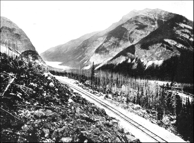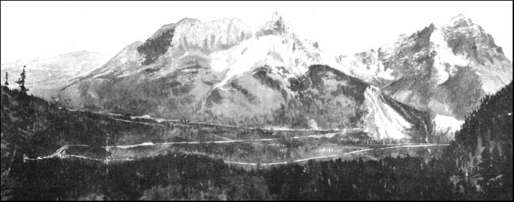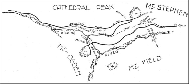 In connection with this reconstruction work some startling and prodigious achievements have been and are being consummated. When the Canadian Pacific Railway was built from coast to coast the practice which had governed the building of the first American transcontinental road was followed ; the line was flimsily built, the governing considerations being completion in the minimum of time with the lowest possible cost. But the inevitable happened. The line was overtaxed, and overhauling had to be taken in hand without delay. The most serious obstacle was in the Rocky Mountains. Here the constructional engineers, in order to avoid expense, had introduced a bank 4.1 miles in length with a grade of 4.5 per cent.—237.6 feet per mile. It was so steep that it became known throughout the system as the "Big Hill." It arose from the suddenness with which the ground falls away through the Kicking Horse Valley between Hector and Field. The Big Hill came to be dreaded by all the drivers who ran through the Rockies. When they reached the top of the bank they shut off steam and tried their brakes. They descended by sheer gravity, applying the brakes now and again to keep the train in check. Switches were introduced here and there, and the switchman listened attentively for the approaching train. If the whistle tooted a certain signal the main line was left open, but if the whistle blared out another cry the switchman knew that the train had got out of control ; he promptly opened the switch, and turned the runaway into a bank. One driver who had handled the heavy freight trains which go down to Vancouver gave me his opinion that "running down the Big Hill licked a lottery to fits. You were certain to hit the bottom of the valley all right, but whether via the railway tracks or in a bee-line through the air it was impossible to say !" As may be supposed, derailments were by no means infrequent. While the run down the Big Hill was full of excitement to the freight train, the ascent was trying to the Overland mail. The train, as a rule, weighed about 710 tons, and a bank such as this was too much for a single engine. At Field they kept a full stable of "pusher" locomotives, monsters of their day, of the 2-8-0 class, and turning the scale at 74 tons apiece. Two, four, five, and even six engines have been requisitioned to lift the mail over that hump, and the roaring and belching as the locomotives struggled up at a crawl of five or six miles per hour transformed the rock-strewn, snow-walled Kicking Horse Valley into a veritable Inferno. When the line was first built it was indifferently ballasted, but the Big Hill became the best-laid piece of track in the mountains—it became packed with the half-consumed coal and ashes ejected from the locomotives as they snorted and struggled up the incline under their loads. The "Overland" going up the Big Hill certainly was an impressive spectacle, but it was poor business. The railway company were aware of this fact ; just how much it cost them to handle the trains over this fearsome bank only they themselves know. At last the management decided to eliminate this drag upon the high efficiency of their system. "The railway must be realigned through the Kicking Horse Pass. Never mind what it costs." This was the official ultimatum to the engineers, and Mr. J. Schwitzer sallied out to fulfil the commands. He searched every nook and cranny of this wild, forbidding stretch of the mountains, and finally came home with the best scheme that engineering science could offer to deal with a difference of 952.5 feet in a handful of 4.1 miles. It was a daring proposal, and it introduced an ingenious solution of a difficult problem, which, though common in Europe, was quite new to the American continent. He decided to use the same device as Hellwag had adopted to secure extrication from a similar tight corner on the St. Gotthard railway : the spiral tunnel. The Kicking Horse Gulch did not give much elbow room for the work ; but Schwitzer outlined a plan which, although it doubled the mileage through the pass, yet reduced the gradient exactly by one-half. The scheme was daring, but was carried out. In entering the pass from the west the railway plunges into a tunnel 170 feet long under Wapta Mountain. Then it swings away from the old line, which traverses the centre of the pass, cuts across the Kicking Horse River, and burrows into the base of Mount Ogden on the opposite side of the ravine. This tunnel is 2,012 feet in length, and therein the train completes a corkscrew twist, emerging into daylight almost directly over the portal, some feet below, by which it entered the mountain. It then runs along the Kicking Horse Valley, crosses the river, doubling back upon itself, running almost parallel with the first part of the line, but in the reverse direction, to gain the opposite side of the valley once more, where it penetrates Mount Stephen to describe another elliptic curve in a tunnel 3,184 feet long. Regaining daylight, the line doubles back on itself once again, until it meets the point where the second line in the zigzag crossed the old line, which is now rejoined. It is a railway maze, the line doubling upon itself twice and crossing the river twice, in order to reduce the severity of the incline.