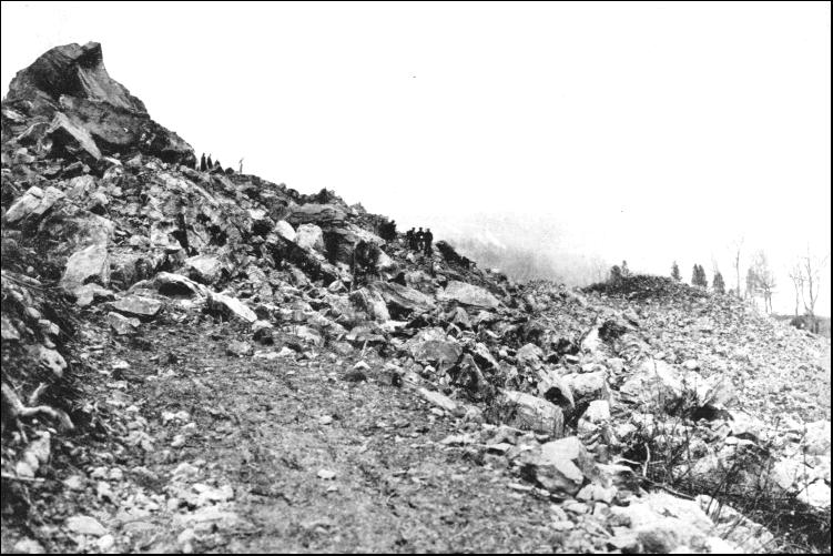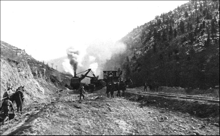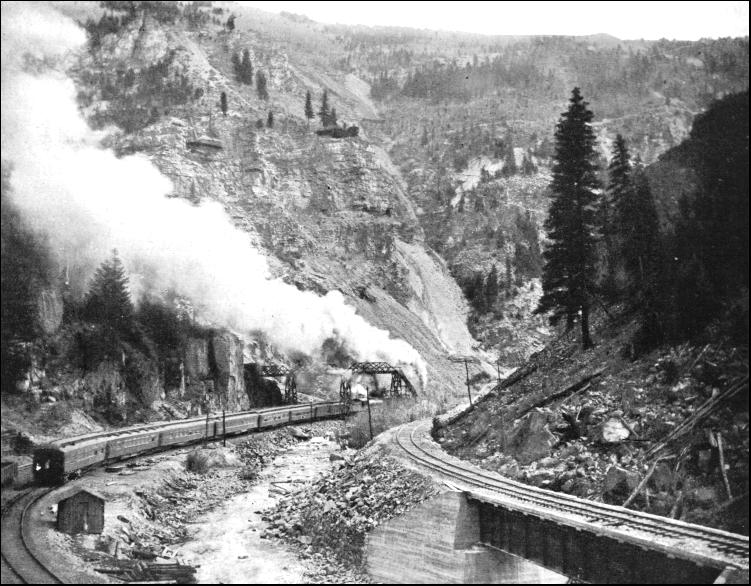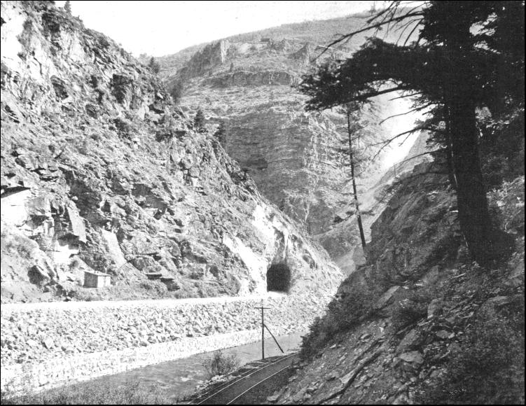 The total length of the new line is 8.2 miles, and in no place is the gradient heavier than 1 in 45.45 feet. In the spiral tunnels, which have a curvature of 573 feet radius, it was found possible to give an easy grade. In the completion of the work 700 men found employment. The two spiral tunnels were driven from each end simultaneously, compressed air rock-drills being used to break down the rock, which, being of siliceous limestone, somewhat facilitated rapid progress. Here and there searching difficulties were encountered. The rock was found to be fissured, so that water gained an entrance into the workings ; but the pumps proved able to cope with the inflow. In other instances treacherous layers of shale were struck, and heavy timbering had to be adopted, and a concrete lining afterwards completed. When the work was commenced hand labour was used for removing the spoil dislodged by the blasts, but this proved so inadequate that powerful steam shovels were brought up, and they kept pace with the drills and dynamite. These shovels were driven by compressed air, so as not to foul the workings. Work was maintained at high pressure the whole time, the tunnels being brilliantly lighted, so that excavation might continue night and day uninterruptedly, while in the open workings oil flares served sufficiently to illumine the scene through the hours of darkness to enable progress to be maintained. At times there was a shortage of men, especially among the unskilled labourers, who, after staying a short while, and having amassed a tempting nest-egg, hied on their way to the Pacific coast, where they could command higher pay for the sweat of their brow. Despite these hindrances, however, the task was completed in about nineteen months, by which time over £250,000 had been expended, of which sum £50,000 vanished in smoke alone, as 1,500,000 pounds of dynamite, sufficient to fill seventy-five box cars, were consumed. But the reconstruction has repaid the Canadian Pacific Railway Company. Whereas formerly a battery of powerful locomotives was required to handle a train weighing 710 tons, now a train weighing 980 tons can be handled easily by a double-header at a speed of 20 miles an hour. Not only is the cost of working over this section reduced by over 60 per cent., but there is an improved time schedule, while a greater degree of safety is secured to the travelling public. When the engineer is called upon to thread a forbidding rugged mountain range, he generally takes advantage of the natural paths to carry him through the obstacle. A river is an ideal channel, although it may possess the drawbacks of wandering apparently aimlessly among the precipitous crags, making sharp twists and bends. The latter, however, can generally be circumvented by driving short cuts with tunnels across the loops. As a rule, however, the waterway is constricted, and will occupy the whole floor of the gorge, while its level fluctuates wildly. In the spring it is a babbling brook rolling peacefully along ; but in the late summer, when the torrid sun melts the snow on the peaks, causing rivulets and creeks to dance down the cliff sides into the main channel, then the waterway rises suddenly to a high level, and tears along fiendishly, sweeping all before it. Such a situation faced the engineer when he was called upon to carry the railway through Eagle Canyon, Colorado, for the Denver and Rio Grande system. He searched the ravine, and found a convenient ledge, which he seized here and there, smoothed it off, and laid down his metals. It is a V-shaped rift, with the mountains hurrying skywards on either hand from the waterway. But the ledge afforded a foundation. Where it was interrupted by knots of rock the engineer either blew them. away to the width he desired or tunnelled them—whichever was easier, cheaper, and quicker. He strengthened his rampart where it was weak with a massive stone wall, and entertained no apprehensions that his work would be washed away when the turbulent Eagle River rose in flood. But in course of time the single track used for both up and down traffic became inadequate. The Goulds got control of the line, and, what was more, at the end of thirty odd years achieved the height of their ambitions : they had a connection running to the Pacific—the Western Pacific Railway. A new source of traffic was tapped, to carry which rendered a second pair of metals through Eagle Canyon imperative. The engineer was commanded to double track the line for six miles through the gulch. It seemed a simple task to fulfil, but he had different notions. The existing ledge was just wide enough to take the one pair of rails and no more. The shelf could not be widened very cheaply, as it meant trimming back the toes of the cliffs somewhat heavily. There was another similar though not so well defined ledge on the opposite side of the river. He decided to press that to his aid. The first thing was to control the waterway, to keep it within bounds, so that it could not thunder, foam, and tumble where it pleased. He threw up a massive masonry wall. In so doing he drove the water back somewhat, but to guard against all risk, the existing ridge was fortified with new masonry here and there. The result is that to-day the Eagle River ripples or rushes, according to its mood, along a big ditch, fenced in on either side by a heavy, well-built masonry wall, which defies the waterway's most violent outbursts of frenzy. By being compelled to take to the opposite side of the river for his second line, the engineer was brought face to face with another obstacle. The cliffs are steep, but here and there they are scarred by wide gullies filled with loose rubble and detritus. These are the tracks of avalanches, rock-slides, and landslips. They are well defined, and the movements follow these passages every year, as certainly as night follows day. These destructive forces had to be avoided ; accordingly the engineer swung his line 