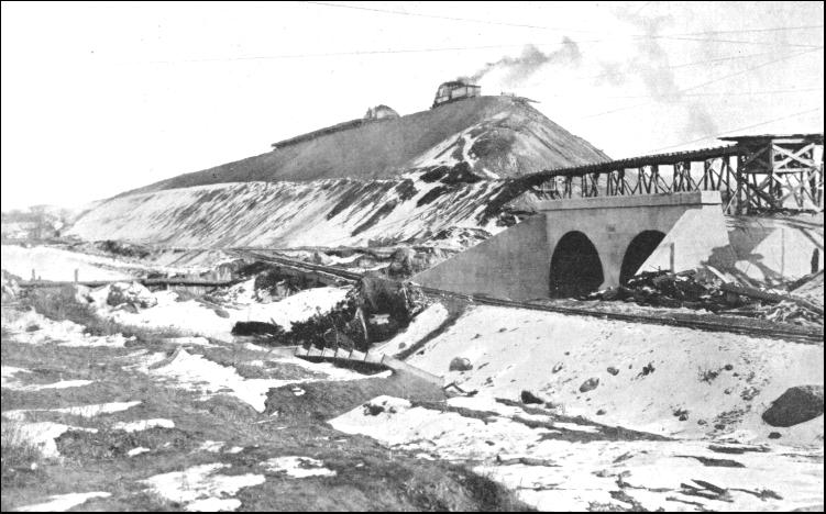 One of the most striking instances of the endeavour to straighten out a railway built in a hurry was on the Delaware, Lackawanna and Western Railroad. As in the case of other systems of today, this railway had a modest beginning, but as time progressed it threw out additional tentacles ; absorbed short lines that stood in the way ; and these threads were welded into a homogeneous whole. An intricate network of lines stretching from the Great Lakes to the Atlantic seaboard, and penetrating the rich coal areas of the Eastern States has been woven in this manner. The district threaded is very mountainous, and the original engineers ran their lines through the natural cracks in the mountains, paying no regard to the big detours, and troubling little about grades and curves. The result was that when later railways penetrated this rich territory with straighter, flatter, and shorter routes the original system found its traffic threatened. This menace assumed serious proportions. Between Hopatcong and Delaware Gap the company possessed as bad a stretch of 39-1/2 miles, as could have been built. It abounded in curves which, in the aggregate, described fifteen and a half circles, representing nearly 13 miles, while grades ran up as high as 60 feet per mile. These conditions limited the load per locomotive to thirty cars, as compared with seventy-five similar wagons which were hauled by one engine on competitive roads. Such a disadvantage could not be tolerated. Accordingly the engineer was called in and told by President Truesdale to find a shorter cut between the two points at any cost. Accordingly a new route was discovered showing a saving of 11 miles, the wiping out of four and a third circles of curvature, and a grade reduction to 29 feet per mile at an estimated cost of approximately £2,000,000. Despite the alarming proportions of the cost, the engineer estimated that one hour could be clipped off the running time of the goods trains, and twenty minutes off the schedule for the expresses ; and that the saving in working and maintenance charges would be sufficient to defray interest on £2,100,000. Thus the engineer was on the right side, and accordingly was told to "go ahead." It was a daring scheme. Here were 39-1/2 miles to be wiped out of existence and a new line, 28-1/2 miles, to be built at something like £66,000 per mile. Mr. G. J. Ray, the engineer-in-chief, ventured to me his opinion that this "work is the heaviest per mile of any large railway ever undertaken in the United States." The earth and rock excavation averaged about 500,000 cubic yards per mile. This will afford some idea of what was entailed in carrying out the Lackawanna Cut-off, as it was called. There was a heavy premium on the services of dynamite and steam shovels. The cuts were amazing ; the embankments startling. There was one wide valley among the tumbling ridges, which ran transversely to the location. "How was that to be filled ?" asked the farmers in the depression. "By an embankment," retorted the engineer, and before the agriculturists in the valley realised the significance of this work, overtures were being made to buy out their farms. The base width of an embankment ranging from 75 to 110 feet high would be too great to be accommodated in the ordinary right-of-way, while, had the railway purchased just the necessary strip of land, such little pieces of farms would have been left that they would not have been worth cultivation. The farmers accordingly were compensated with big cheques for their property, and went off to pastures new, while the railway engineers set to work building up the massive ridge of the Pequest Fill, with over 6,600,000 cubic yards of spoil. The plant turned to work on this cutoff represented a fortune in itself. One contractor had sufficient engines and cars to run a small railway, and he valued them at £40,000. Every possible device which would hasten construction, and save time and labour, was adopted. The ridges were not built up in the ordinary dumping way. A ropeway was stretched across the ravine, and from this was suspended a track laid on sleepers. The engine backed the loaded trucks on to this swinging track to be emptied. At other points towering timber trestles were erected. Rails were laid on top, over which the ballast cars rumbled and dumped their loads until every sign of the timber had disappeared beneath the big earthen bank. The cuttings were as stupendous as the embankments. There is one as deep as the Pequest Fill is high, the trains hurtling along a huge trench 100 feet deep. In one instance the builders drove their way for half a mile through granite, wherein the persuasive efforts of dynamite were required to dislodge 1,000,000 cubic yards of rock. Some of the blasts were strikingly large. In a single detonation 40,000 lb. of dynamite shivered a complete mountain nose. Smaller blasts, ranging up to 1,000 lb., were almost of hourly occurrence. In fact, the demands for this rending and splitting agent were so steady and large that a factory was set up near Hopatcong for its manufacture upon the spot, supplies being delivered as required by the wagon load. By the time the track was opened for service over 5,000,000 lb. of dynamite had been used.