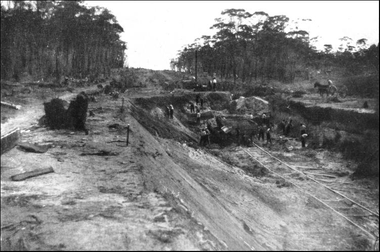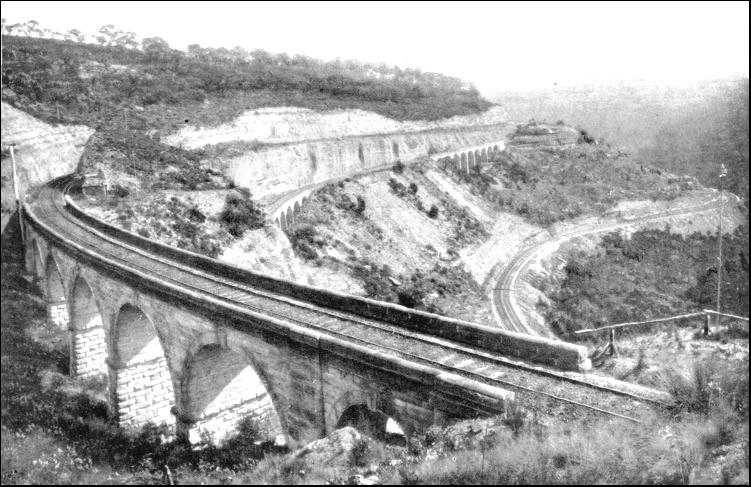 Such a stipulation prevented tunnelling as originally planned, so the engineer devised an ingenious way out of the difficulty. He brought the railway to the base of the drop, and then started out to climb up one leg of the V to the highlands above. The line could not be taken up in a single run, as the gradient would have been too heavy—those were days before the rack came into vogue—so he sawed his way up the slope. The line crawled upwards along a winding incline at 1 in 42 from one end of the ravine to the other. Here there was a dead end, but another gallery was hewn out of the cliff on a similar incline, only in the reverse direction to another dead end, from which a third ascending grade carried the line to the top. It was exasperatingly slow and perilous work, cutting the three ascending shelves in the mountain-side, following its windings, and erecting massive masonry viaducts over the deep rifts. In ascending the mountain-side the engine hauled the train along the bottom gallery to the dead end ; then it pushed it up the succeeding step to the second dead end, where the engine, being once more to the front, hauled its load to the top, and thence on to Bathurst. The "Zigzag," as this striking example of engineering skill was called, became one of the sights of the country, but in course of time it played havoc with economical operation. Train weights became limited as well as speeds, and this threatened a congestion of traffic. Accordingly, the issue of eliminating the Zigzag arose. It was certain to be a costly proceeding. This fact was realised fully, but overhaul in railway work is always costly.