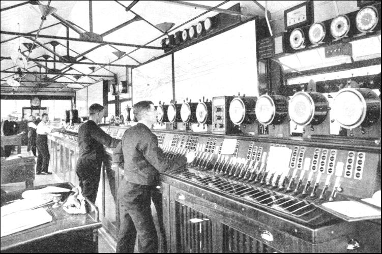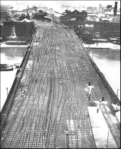 Electric signalling, it was decided, should ultimately be installed all the way from Waterloo to Hampton Court Junction, beyond Surbiton, a distance of 13-1/2 miles. Between the various junctions this signalling, as on other electrified sections of the Southern Railway, can only be automatic ; at the junction points many of the ordinary signal cabins would not be suitable. The working must be concentrated in large cabins containing complex electrically-worked signal-frames. One advantage of electrical signal-working is its simplicity. In a manually-worked signal-frame every movement of a signal, a switch, or a locking-bar involves a separate movement of a lever ; but in an electric signal-frame, by suitable connexions and relays, one single flick of a miniature lever can be made to perform a whole series of switch and signal movements. And, of course, it requires no physical exertion on the part of the signalman. The great bridge of signals outside Waterloo Station, with "A" signal-box in the centre, which has been so familiar a feature of the view, must inevitably be superseded. Here, then, is an instance in which electric operation of trains has been proceeding for nearly twenty years. It is continually being speeded up, not always by means of new electrical rolling-stock, but more frequently by modernization of signalling and track. In this way there is a constant reduction in the headway between the suburban electrics into and out of the south side of Waterloo varying at present from 4 min. to between 2-1/2 and 2 min., and a tendency to eliminate all the delays. The installation of electric signalling has also considerable economic advantages in enabling signal-boxes and signalmen to be dispensed with. At London Bridge—which handles no fewer than 2,400 trains daily—when electrification was brought into use, the four cabins previously in use were replaced by one large new signal-box. This had a signal-frame of 311 levers—the largest electric signal-frame in the world—controlling the whole of the train movements through the High Level Station, and also into and out of the Low Level terminus. Where fifty men and twelve boys were needed daily, in three shifts, to work the previous four signal-boxes, the present box is worked by sixteen men and eight boys. At the busiest times of the day six men are needed to work the frame—each having his own section of the frame to look after—and four boys to record the movements of the trains in the signal-box books. At Brighton another new electric signal-box with 225 power-operated levers has replaced six mechanically-operated cabins, which had 582 levers between them. Between Coulsdon and Brighton alone fifteen signal-boxes were closed entirely, and were replaced by automatic signalling. Certain others, such as the boxes at Balcombe, Burgess Hill, and Hassocks are "switched in" only when shunting requires to be performed at these stations ; at other times trains are signalled past them automatically. Novel systems in this connexion include the electrical working of the junctions at Copyhold from Haywards Heath signal-box, 2,100 yards away. In the London suburban area the electric signalling is partly "three-aspect" and partly "four-aspect." Three-aspect light signals show red for "stop," yellow for "one section ahead clear," and green for "two sections or more ahead clear." These correspond to a signal-post with "home" and "distant" signal-arms carried on it, showing respectively both arms at danger; the home signal "off" and the distant signal "on"; and both home and distant signals "off." But the four-aspect signal has two yellow lamps, and so can show double yellow for "one section ahead clear" ; single yellow for ''two sections ahead clear" ; and green for "three or more sections ahead clear." In the latter instance the sections are usually somewhat shorter, and the doubling of the yellow indication helps to keep traffic moving at its maximum density on lines that carry an exceptionally frequent service of trains. So far as track arrangements are concerned most of the junctions in the London suburban area of the late South-Eastern and Chatham, London, Brighton and South Coast, and London and South Western Railways were admirably laid out to permit of the maximum possible number of trains being run over them.