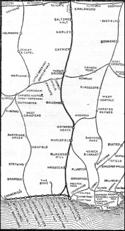 This stretch of track is one of the busiest sections of the route, as only two tracks have now to carry all the trains. But it would be costly to widen, as in addition to Balcombe Tunnel there is the great stone viaduct, near Balcombe, over the Ouse Valley. Travelling at high speed through Haywards Heath we pass Wivelsfield, and, beyond, Keymer Junction. Clayton Tunnel, over a mile in length, carries the train up to the last of the three summits, at its southern portal. Another deep chalk cutting, and the "Brighton Belle" dashes down the final 1 in 264 to Preston Park, where the Hove and Worthing line branches to the west. And finally we travel smoothly into Brighton Central Station, exactly one hour after leaving Victoria.