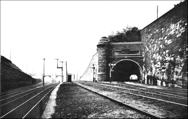 The general belief that a rise of 1 in 330 represented the maximum permissible for working by steam provoked a curious situation upon the section of the line between Euston terminus and Camden Town. Although the surveyors struggled hard, they found it absolutely impossible, owing to physical configuration, to secure a rise of less than 1 in 70 between the two points. They made no attempt to work it by adhesion. Instead, all trains proceeding out of Euston were assisted as far as Camden Town by a cable, which was hitched on to the train and wound in by a stationary winding plant, comprising two engines placed underground at Camden Town. They were of 60 nominal horsepower, and the main pulleys had a diameter of 20 feet. The rope was about 13,000 feet in length, and cost over £450. The system of operating this cable incline was quite in keeping with the times. As they were pre-electric days, another method of signalling the engineman in the winding-house, to notify him when to start his plant, had to be devised. The train was connected to the winding rope by means of a messenger, and when all was ready, a lever, connected to a bell having its edge submerged in water, and suspended over an inverted bell-mouth forming the end of a tube, was depressed sharply. This action caused the air within the bell to be driven downwards through the tube, which extended from the terminus to the engine-house. At the latter point the air-tube was connected to a large whistle—virtually an organ-pipe—and the puff of air sent through the pipe produced a blast on the whistle. Owing to the distance which the air had to travel about four seconds elapsed in transmitting the signal. The winding engine was set in motion, and the train attached thereto was hauled up the incline slowly. When the top of the bank was reached, the official on the train dexterously cast off the messenger without stopping the winding-engines. At times there was a miscalculation, and then the hauling machinery had to be stopped. The haulage of the train by this system occupied from three to four minutes. Needless to say, when the locomotive engineers were able to evolve more powerful engines, and experience proved that the incline could be worked by adhesion, the winding system was abandoned. When the line was first built, the metals were laid on stone blocks, of which 152,000 tons were used upon the 112 miles out of London, at a cost of £180,000. A similar practice had been adopted on the Liverpool and Manchester Railway, where the permanent way rested upon a solid foundation, although on those parts where somewhat soft land was encountered wooden sleepers were used. However, the stone blocks were found to make the road hard and uncomfortable, and inflicted severe wear and tear both upon the track and rolling stock. On the other hand, the stretch of line laid with wooden sleepers was found to be more comfortable, easier, and reduced maintenance expenses. Accordingly, after lying for a short while, the stone blocks between London and Birmingham were removed in favour of wooden sleepers. From the day when the Liverpool and Manchester, the Grand Junction, and the London and Birmingham Railways were fused into one organisation, the principle of acquiring other individual roads was pursued. Thus, not only was competition eliminated, but the field of operations was widened very considerably. The London and North Western system to-day is in reality a combination of about sixty different railways throughout the Midlands, Wales, and the North of England to the Border. A prudent policy of constructional extension also was followed, so that to-day the ramifications of the undertaking represent a network of some 2,000 miles.