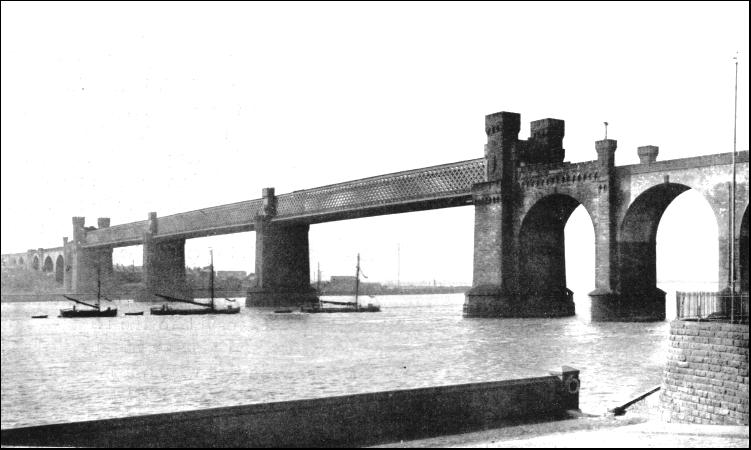 Taken on the whole, the system does not possess many important works which under present conditions would rank as startling pieces of engineering, although in the early days many achievements created intense interest, and were regarded as marvels of human activity. The Kilsby Tunnel represents, perhaps, the most interesting illustration of tunnel-boring, owing to the abnormal difficulties which were encountered, while the tubular bridge across the Menai Straits, although subsequently eclipsed in point of length and importance by other similar structures, never has lost its fascinating interest, inasmuch as it was the first work of its class. This bridge, 1,510 feet in length, comprises two immense rectangular tubes— one for each set of. metals—through which the trains pass. It was designed by Robert Stephenson, and was commenced in 1845. There are four spans, two each of 460 feet and two each of 230 feet, supported on masonry piers, giving a clearance of 103 feet 9 inches between the under side of the tubes and the water at high spring tides. At the ends the tubes are 23 feet in depth by 30 feet deep at the centre. The most interesting feature was in connection with their construction and setting in position in the days when facilities were slender and equipment of an indifferent character. A special plant of an elaborate, ingenious and expensive nature was set up for the work. While the erection of the piers was in progress, the construction of the box-tube spans was carried out on the banks of the Straits. When completed, the tubes were transferred to pontoons, and were floated to the site when the water was at high tide. By means of capstans and ropes the pontoons were warped into position between the piers until the ends of the tubes were brought dead into position in grooves in the masonry, where they were made fast. As the tide fell, the pontoons dropped clear of their loads, leaving the tubes resting on their seats. The tubes were then raised by the aid of a huge overhead hydraulic press, which by means of chains lifted them 6 feet at a time, the masonry being completed beneath as rapidly as possible after each lift. As the links of the chain could be withdrawn as required, having been made specially for this purpose, after each lift the chain was shortened, and the plunger of the hydraulic press permitted to descend. The shortened chain was then re-attached to the metallic work, and the ram of the plunger forced out again, lifting the mass a further 6 feet, to permit the masonry to be continued upwards a similar height. This cycle of operations was continued until the tubes were brought to the required level, the chains and plunger being called upon to handle, in this way, a maximum weight of 1,144 tons. The total weight of iron worked into the tubes is about 10,375 tons, and the walls present a superficies of 1,219,680 square feet for painting. As the tubes are continuous from end to end, they stretch about 6 inches in summer, under the influences of higher temperature.