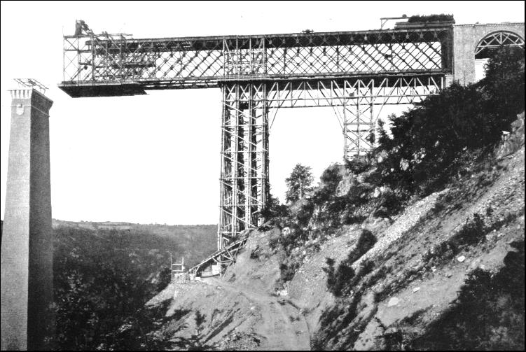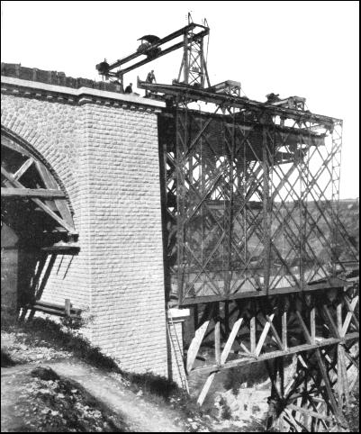 Owing to the diminishing sectional area of the towers as they rose upward, the space upon which the masons toiled grew more cramped every day. When the last course of stones was set in position the labourers were almost on a level with the tableland on either hand. Then a heavy cradle was rigged up to encircle each pier, and swung from the corners of the tower tops. This was lowered, with a small gang on board, who pointed and applied other finishing touches to the stonework facing, being hauled up and down from their working level on the swinging platform, which was caged in to protect the men from falling. By the time these two lofty piers were completed £52,000 had been expended, while the total cost of all the earthwork and masonry for the structure was £98,000. As the towers approached completion preparations for setting the steelwork were advanced. The shore span of 380 feet springing from the Pauniat side was taken in hand first, in 1904. When it was decided to erect the lofty masonry piers, serious objections were raised in certain quarters that high winds would set up heavy oscillation—that they would sway to and fro in the same manner as tall factory chimneys and other similar structures respond to the pressure of the winds. The engineers, however, who had studied the wind velocities minutely, replied that they had so designed their work as to balance any such stresses that could be brought to bear upon it, and with a good margin to spare. Moreover, they maintained, once the steelwork was in position, that the whole fabric would be braced together and be rendered as rigid and solid as a rock. The first half of the shore section was built upon a heavy timber false-work. When the steel reached the outer edge of this timbering it was continued over the intermediate gap of 190 feet to the top of the first main pier. To counterbalance the increasing weight of this overhanging section a huge counterweight of steel rails was placed upon the part of the span already completed at the shore end. The steelwork, comprising a rectangular structure measuring 22-3/4 feet wide by 40 feet in height, built up of two main side-latticework trusses, was erected upon lines evolved by M. Cartier, one of the engineers to the Cail Company. There was a large cage, which slipped over the end of the truss. This was fitted with rollers, which ran along the top girders, so that the cage could be pushed forward as the steelwork crept outwards. In order to extend complete protection to the workmen this traveller was enclosed in network to the top of the sides, while the floor was solid. Consequently, if a workman missed his footing he was saved from certain death. Similarly the loss of tools was obviated, as they could be recovered easily. On the top side of this cage a small overhead travelling electric-driven crane was mounted. As it was able to move over the full length and width of the metallic work, this appliance commanded the whole working area, so that the heavy pieces of steel were lowered into position easily, while the cumbrous tools by which the sections were riveted up were similarly moved from point to point as desired. After the Pauniat shore span was completed to the first pier, the timber false-work was taken down, transferred by the incline railways to the St. Eloy bank, where the shore span, of identical length on that side, was set in position in a similar manner.