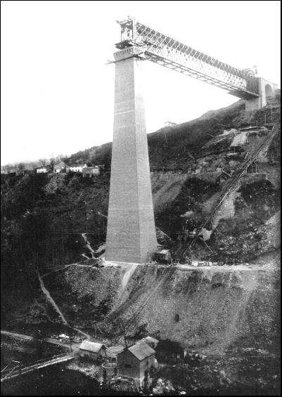 The urgency of this undertaking had been maintained for many years in order to complete the Tulle-Clermont and Montluçon-Gannat railway. But the Sioule River offered an insurmountable obstacle. The ravine is a huge deep V in the rugged centre of France, the banks sloping down at an angle of some 45 degrees to the river at the bottom, while the distance across the gap at the top exceeds 1/4 mile. Investigations proved that the only means of negotiating this interruption was by connecting the upper points of the V, it being impossible to carry the line down the valley slopes to cross at a lower level. A wide variety of competitive designs for a bridge were prepared and submitted to the authorities. After careful investigation the proposal of M. Draux, the Government engineer, found favour in Ministerial eyes. The successful engineer when submitting his ideas was careful to emphasise that the difficulties of erection would be abnormal, and that new, untried methods would have to be called into service, the success of which, from lack of experience under similar conditions, was uncertain. The issue became complicated, because during the examination of the various designs other unexpected problems came to light, so that the whole question had to be threshed out anew. Considerable delay thus arose. Repeated adjurations were made to commence the work, but the authorities refused to be hurried, in view of the magnitude of the enterprise. There must be no possibility of failure ; no cessation of work when once started, through the "unexpected" suddenly revealing itself; and, above all, absolute safety must be assured. Every contingency that might crop up was considered and due provision made therefore. When official approval was extended at last, the designs provided for a bridge with a total length of 1,526 feet divided into four spans. The outstanding feature was the main span above the waterway and its massive masonry piers.